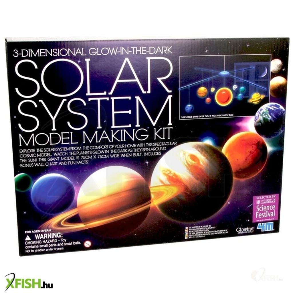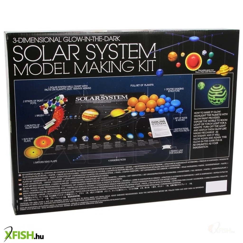 Hagyd, hogy a képzeleted a csillagos égig, de legalább a Naprendszerig szárnyaljon! Készítsd el és lógasd fel saját Naprendszered a 4m nagy Naprendszer készlet tartalmával! A műanyag bolygókat ki kell pattintani a foglalatukból, fesd ki őket, majd köss rájuk damilt, végül állítsd össze a lógatható keretet! A napnak sugarakat, míg a Szaturnusznak gyűrűt tudsz adni. A 4m nagy Naprendszer készlet világít a sötétben, így este is gyönyörködhetsz a Nap körül keringő bolygók, a Merkúr, a Vénusz, a Föld, a Mars, a Jupiter, a Szaturnusz, az Uránusz és a Neptunusz látványában! A 4m hordozható Naprendszer készlet összerakott átmérője 75 cm, a bolygókat a csillárra tudod felakasztani.