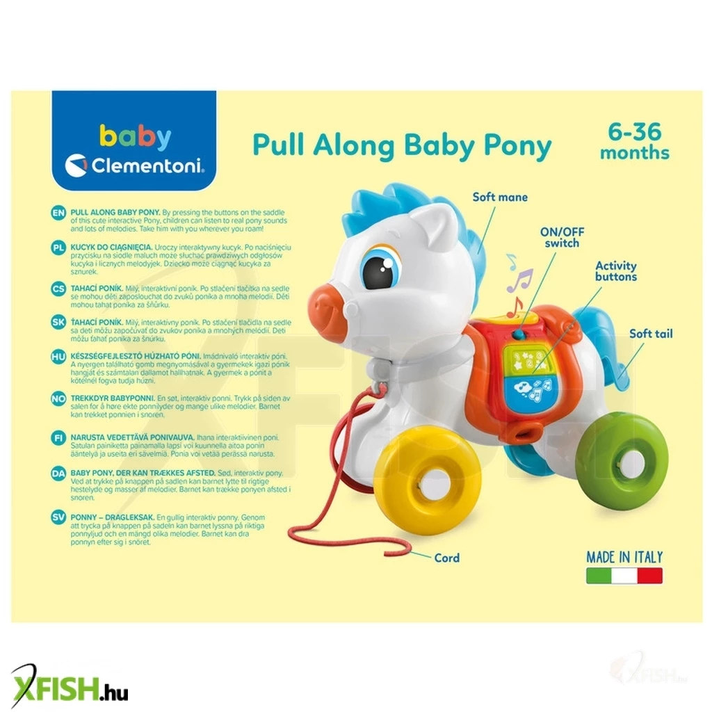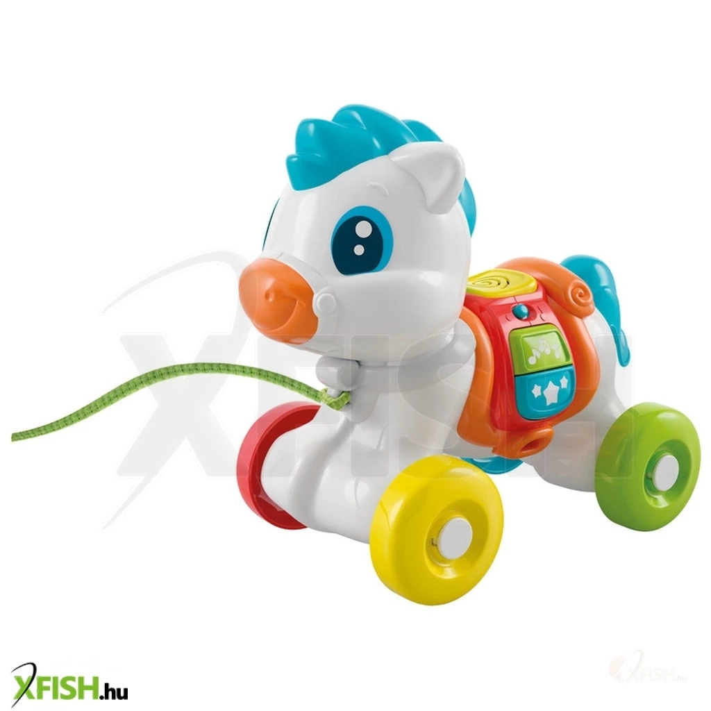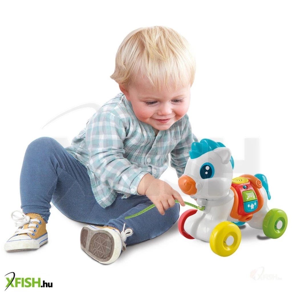 A barátságos póni a nyergén található gombok sorozatával kel életre, és ettől eszik, nevet, és hanghatásokkal szórakoztatja a gyermeket. Az interaktív gombokkal, kerekekkel és pórázzal ellátott póni támogatja az érzékszervi fejlődést, valamint fejleszti a motoros képességeket.