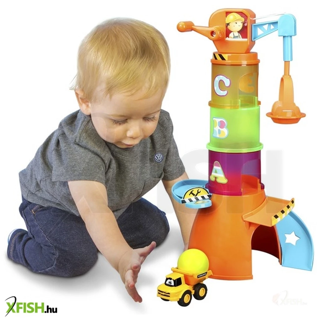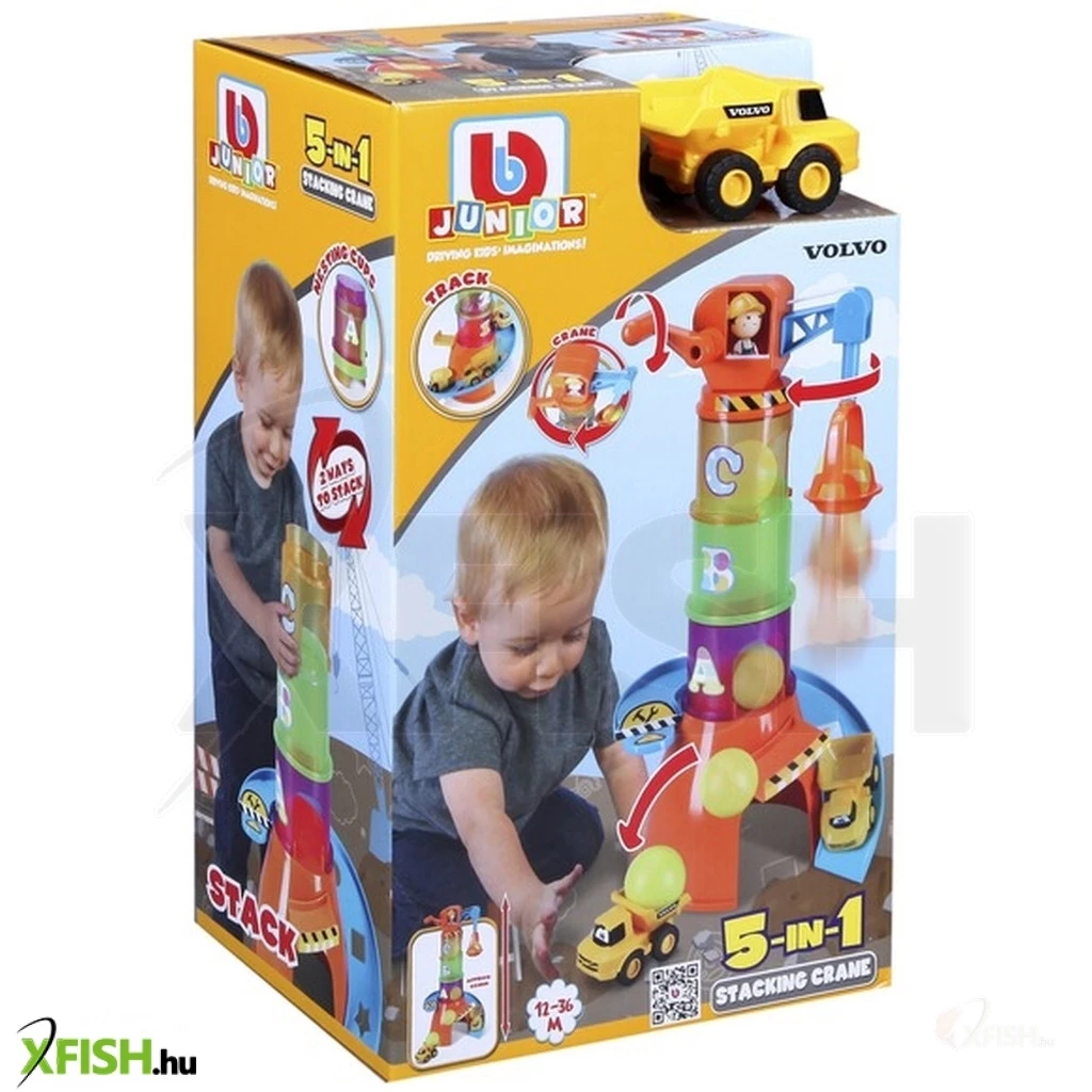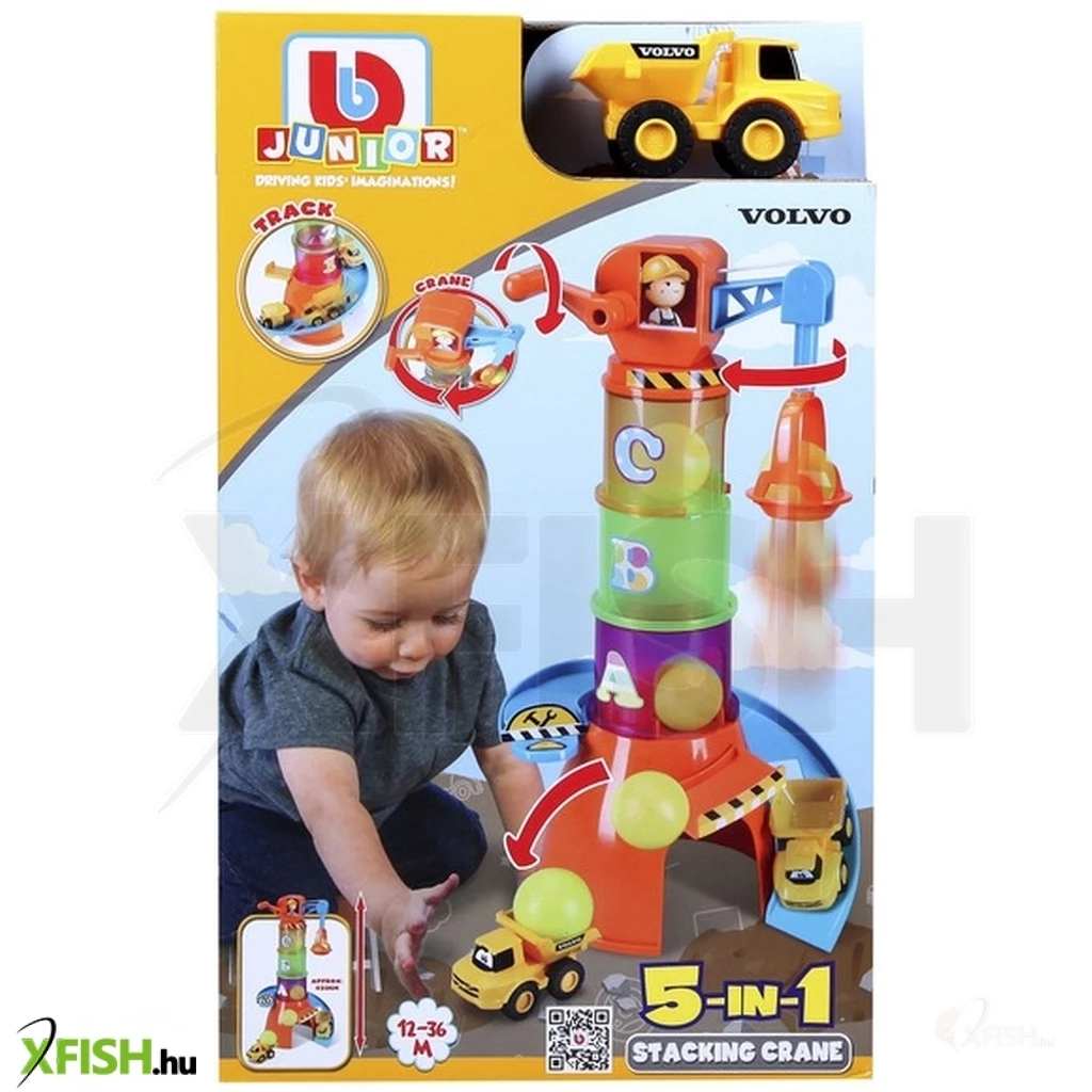 Építsd meg saját színes darudat! A Bburago Jr. -Volvo darus bébijáték készletének elemeivel végre otthonodban is átélheted a szállítmányozás izgalmait. Helyezd hát egymásba a számokkal ellátott tégelyeket, rakd a torony tetejére az emelőkart, és már fel is liftezheted a különböző emeletekre kedvenc járgányaidat! Ha pedig még nagyobb kalandra vágynál, vidd fel a magasba a játékgolyót, indítsd el az építkezési autót a lejtőn, és próbáld meg a gyorsuló járműbe ejteni a labdát! Vajon sikerül elsőnek bele találnod- A Bburago Jr. -Volvo darus bébijáték 5 az 1-ben készlet csomagolásának méretei: 33 x 20 x 15 cm. A játékot 1 éves kortól ajánljuk.