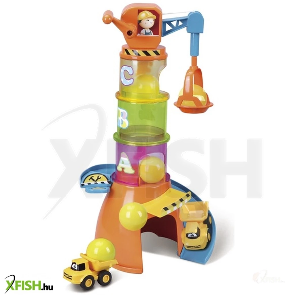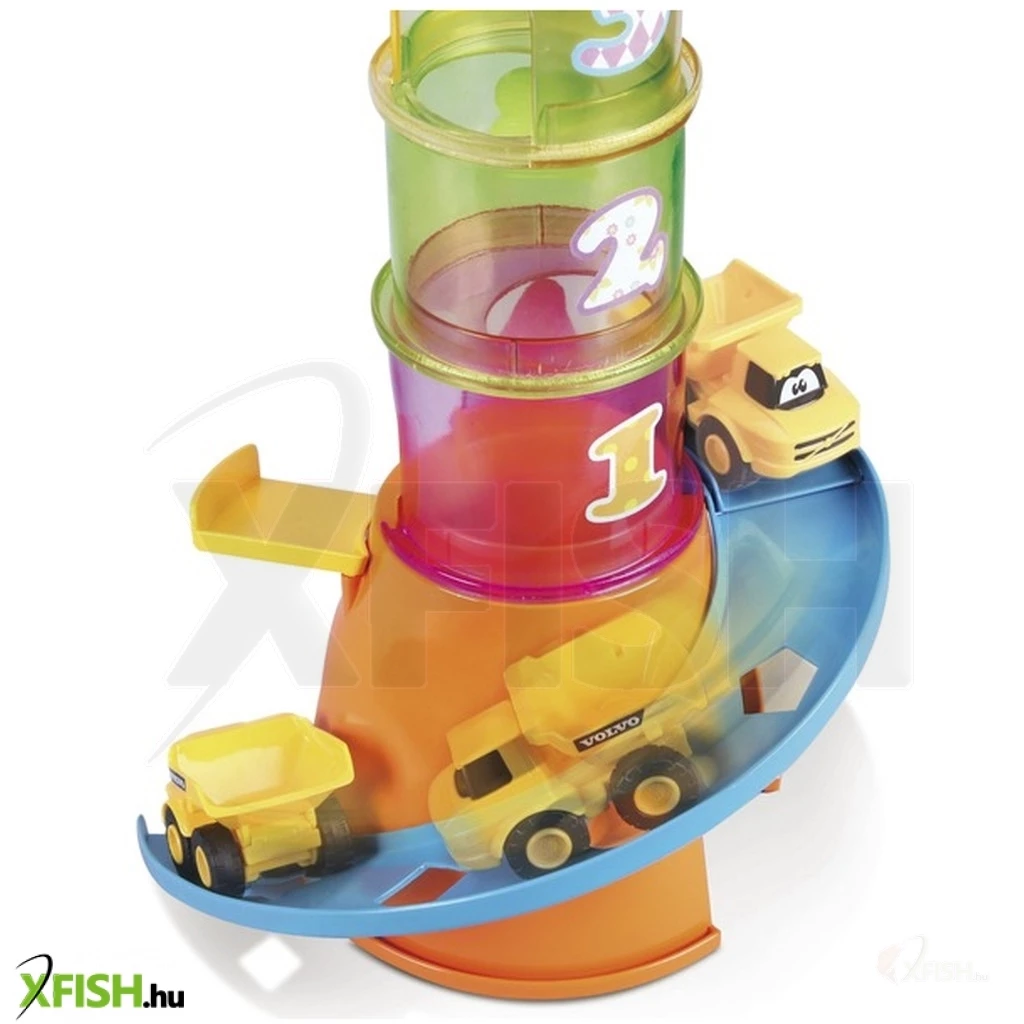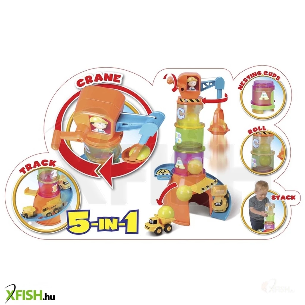 Építsd meg saját színes darudat! A Bburago Jr. -Volvo darus bébijáték készletének elemeivel végre otthonodban is átélheted a szállítmányozás izgalmait. Helyezd hát egymásba a számokkal ellátott tégelyeket, rakd a torony tetejére az emelőkart, és már fel is liftezheted a különböző emeletekre kedvenc járgányaidat! Ha pedig még nagyobb kalandra vágynál, vidd fel a magasba a játékgolyót, indítsd el az építkezési autót a lejtőn, és próbáld meg a gyorsuló járműbe ejteni a labdát! Vajon sikerül elsőnek bele találnod- A Bburago Jr. -Volvo darus bébijáték 5 az 1-ben készlet csomagolásának méretei: 33 x 20 x 15 cm. A játékot 1 éves kortól ajánljuk.