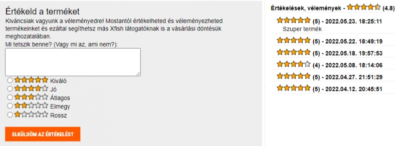 1. Az Xfish webáruházban lehetőség van vásárlással nem- és vásárlással igazolt értékelés leadására is, ez megkülönböztetve jelenik meg az értékeléseknél.