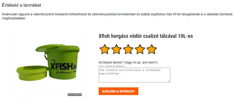 2. Megvásárolt termékek értékelése: Az Xfish webáruház a sikeres vásárlás és a termék átvételét követően 6-8 nappal egy termék értékelést kérő e-mailt küld a vásárló - a megrendelésben megadott - e-mail címére, melyben lehetőség van az átvett termékek szöveges és pontszámos (csillaggal) értékelésére.