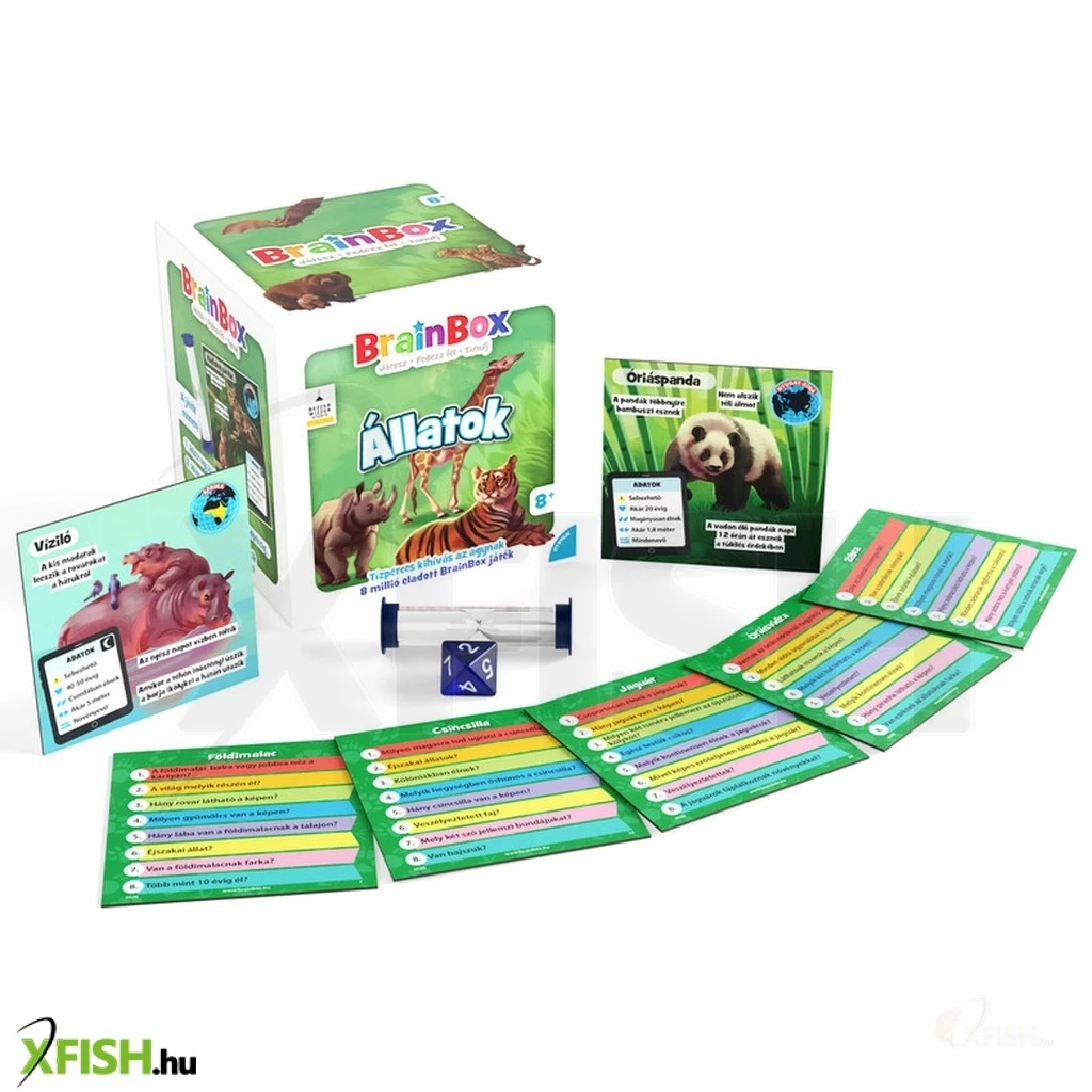 Brainbox - Állatok A BrainBox - Állatok egy szuper agytorna az egész család számára! Kérdés az: Mit jegyzel meg 10 másodperc alatt--- A játékot kétféle módon lehet játszani. Kettő vagy több játékos esetén az első játékos húz a dobozból egy kártyát, melyet 10 másodperc alatt kell a lehető legjobban megfigyelnie. Az idő leteltével a kártyát átadja egy játékostársnak és dob a dobókockával. A dobásnak megfelelő számozású kérdést fogják neki felolvasni és ha helyes a válasz, megtarthatja a kártyát. Ha helytelen a válasz, a kártyát vissza kell tenni a dobozba, és a következő játékos húz. A játék célja: légy Te, aki a legtöbb kártyát gyűjti össze 10 perc alatt! A játék egyedül is játszható, ekkor az idővel kell felvenni a harcot. A kártyát a megfigyelés után le kell fordítani és leírni egy lapra a kérdésekre adott választ. Ha jó a válasz, tiéd a kártya! Számold meg, hány kártyád gyűlt össze 5 vagy 10 perc alatt! Fontos! A kérdésekre minden válasz megtalálható a kártya képes felén, tehát alaposan nézd meg! A doboz tartalma: 70 db kártya, 1 db homokóra, 1 db dobókocka, 2 db játékszabály