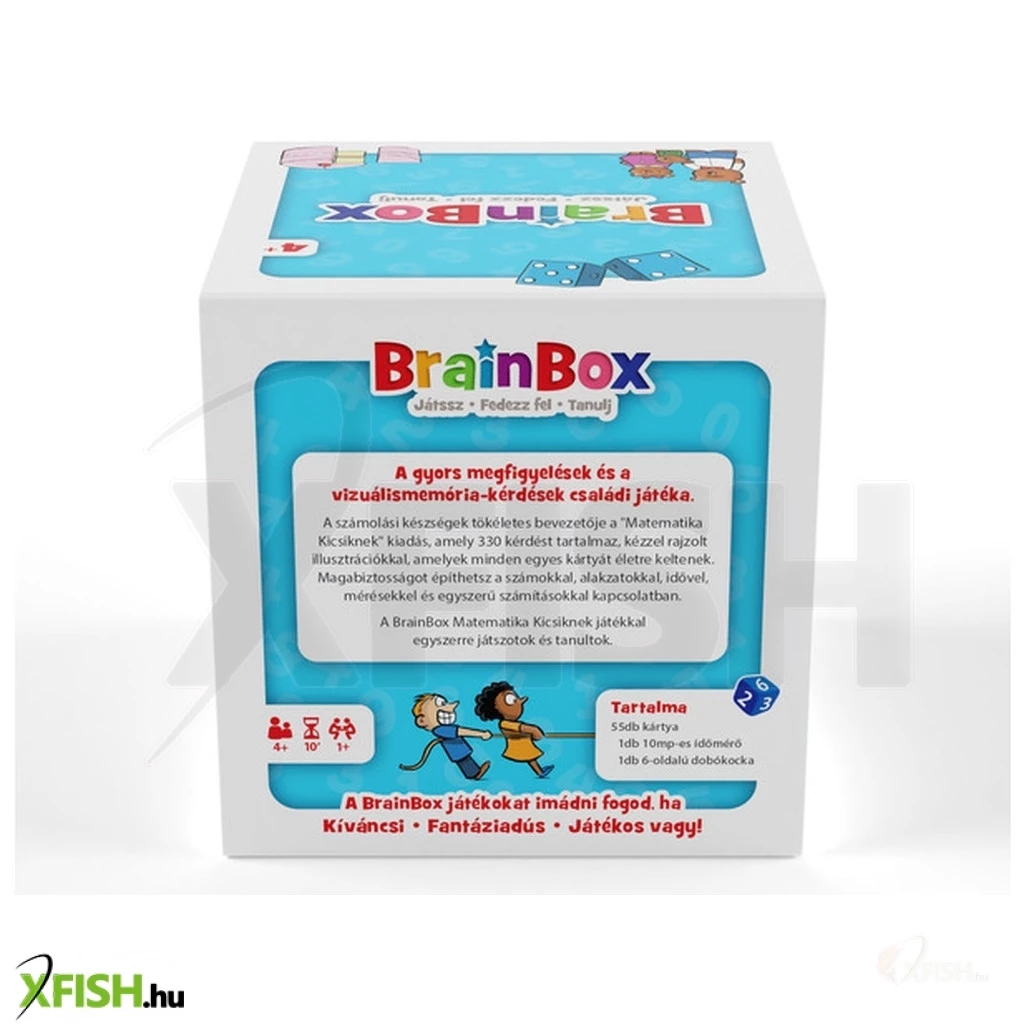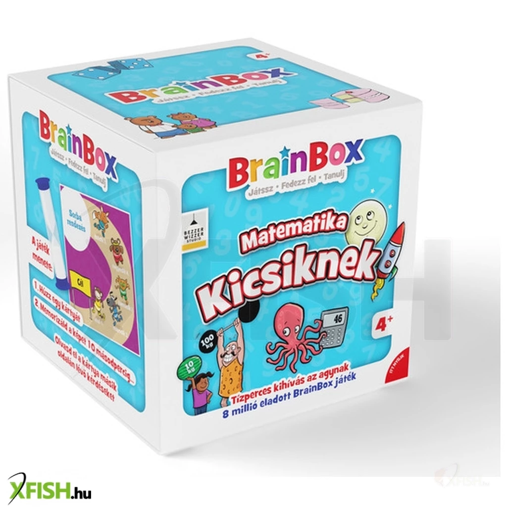 A BrainBox – Matematika kicsiknek új kiadás egy gyors, szórakoztató fejlesztő kártyajáték, amely játékos formában vezeti be a gyerekeket a számok és alapvető matematikai fogalmak világába; a játék során a gyerekeknek 10 másodpercük van megfigyelni egy színes, illusztrált kártyát, majd egy dobókocka segítségével kiválasztott kérdésre kell válaszolniuk, így egyszerre fejlődik a memóriájuk, koncentrációjuk és matematikai gondolkodásuk; a feladatok között szerepel számolás, összeadás, kivonás, mennyiségek felismerése, formák és akár az idő fogalmának megértése is, így ideális első lépés a matematika tanulásában ; a játék 55 kártyát, homokórát és dobókockát tartalmaz, 1–6 játékos játszhatja, általában 10 perces játékidővel, és már 4–5 éves kortól ajánlott, így tökéletes választás ovisoknak és kisiskolásoknak ; egyszerű szabályai miatt akár egyedül is játszható gyakorlásként, de családi játéknak vagy iskolai fejlesztéshez is kiváló, mert észrevétlenül tanít és közben végig szórakoztató marad.