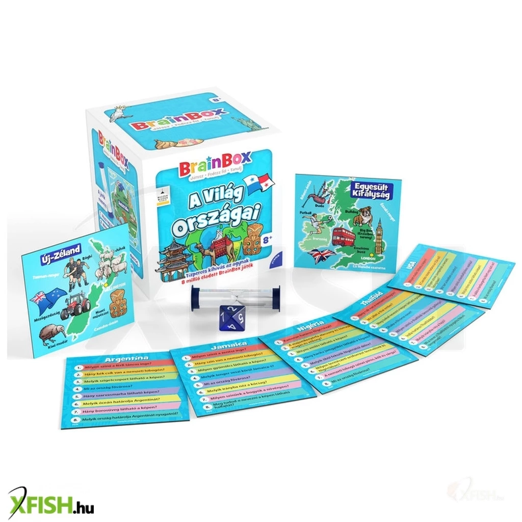 A BrainBox – Világ országai egy rendkívül pörgős, oktató jellegű kártyajáték, ahol a játékosoknak mindössze 10 másodpercük van megjegyezni egy országot bemutató kártya részleteit, majd kérdésekre kell válaszolniuk róla; a játék célja, hogy minél több kártyát gyűjts össze helyes válaszokkal, miközben fejlődik a memóriád és bővülnek földrajzi ismereteid ; a kártyákon zászlók, fővárosok, nevezetességek és érdekes tények szerepelnek, így a játék egyszerre szórakoztató és tanulásra is kiváló ; 1–több játékos részére készült, kb. 10 perces játékidővel, és már 8 éves kortól ajánlott, így ideális családi játékhoz, utazáshoz vagy akár iskolai fejlesztéshez is; a doboz általában kártyákat, homokórát és dobókockát tartalmaz, így minden adott egy gyors, gondolkodtató játékhoz.