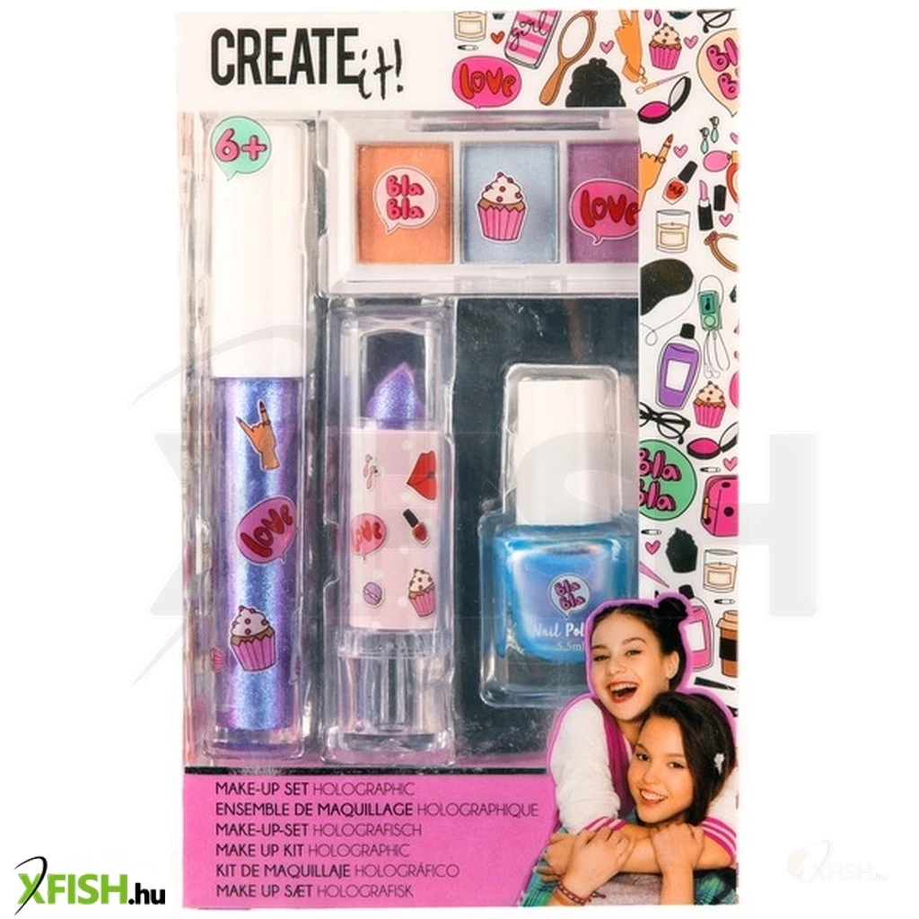 Cicomázd fel magadat színes körömlakkokkal, sminkekkel! A Create It smink készlet körömlakkot, rúzst, szájfényt és szemhéj púdert tartalmaz, amikkel különböző színű sminkeket tudsz elkészíteni. A sminkek élnk színűek, és nem tartalmaznak egészségre ártalmas anyagot. A sminkeket könnyen el lehet távolítani. A Create It smink készlet csomagolási méretei: 10 x 3 x 15 cm.