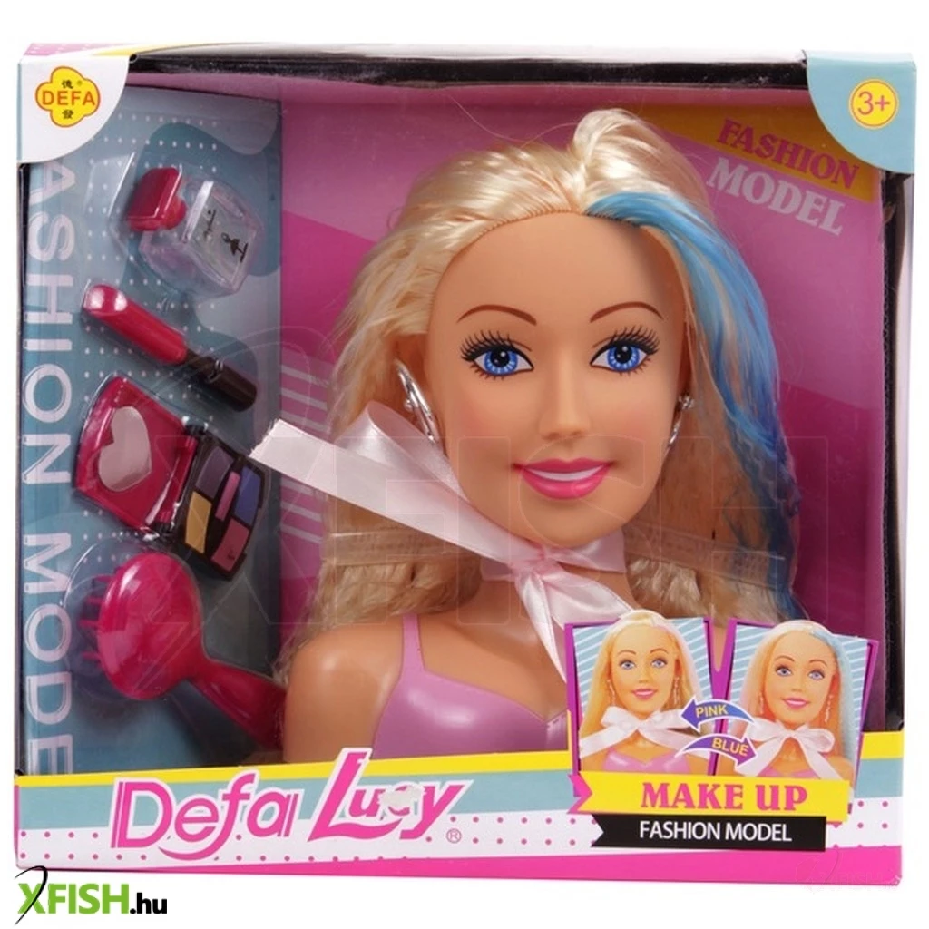 Fesd ki a babafejet, és készíts neki színes hajtincseket! A Defa Lucy sminkelhető babafej egy nagyobb méretű, hosszú tincsekkel készült babafej, amin a sminkelést, hajfestést tudod gyakorolni. A baba masnit hord a nyakában, a készletben különböző szemfestékeket, hajkefét, és arcfestékeket is találsz, amikkel egyedi arcot készíthetsz. A Defa Lucy sminkelhető babafej megtanít, hogyan kell szép sminkeket készíteni, és még a kézügyességet is fejleszti. A fej mérete: 18 cm.
