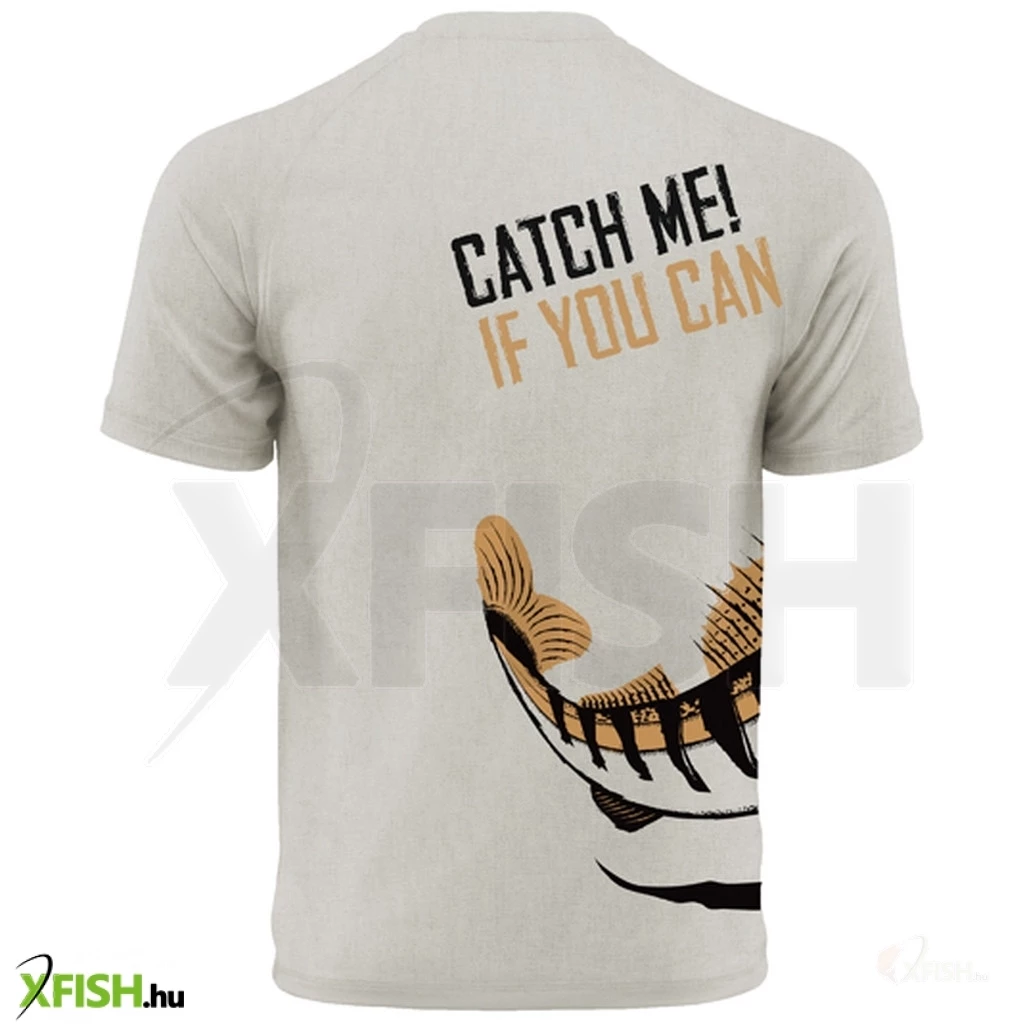 A Catch me! SÜLLŐ póló krém színű, melyen a süllő a csalihoz közelít, ami minden horgász vágya.