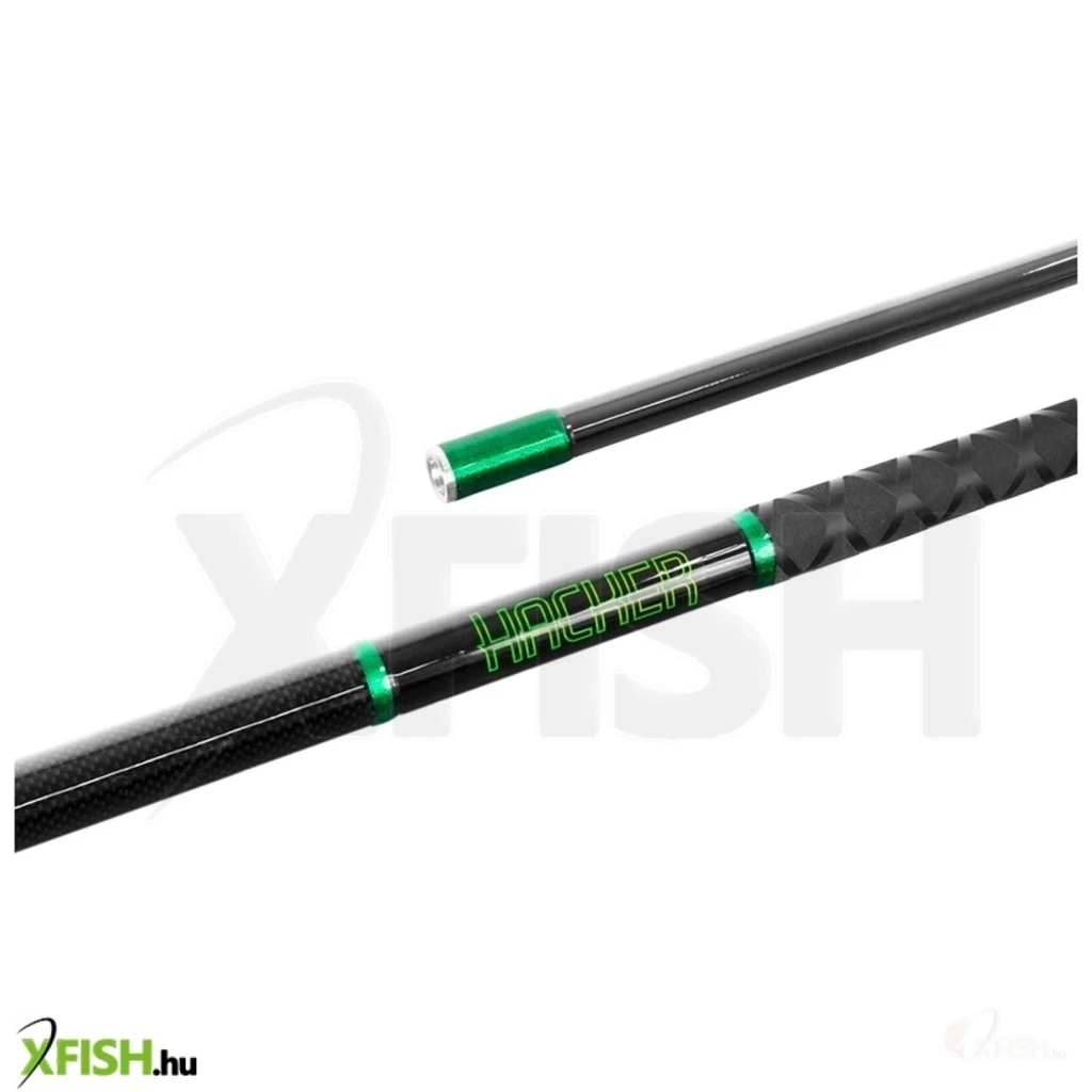 Kétrészes teleszkópos merítő nyél HACKER, 210 cm hosszban az erős és ellenálló 24T karbonból. A nyél a kellemes NEO-FOAM anyagból készült, melynek köszönhetően nedves kézzel való használatnál sem csúszik ki a kézből és jó fogást biztosít. A HACKER merítő nyélen a nyél fölött zöld cérna kötés van, valamint itt található a hosszról, használt anyagról és megnevezésről az információk. A merítő nyél alsó tagján fekete 3D-és karbon díszítés van, míg a felső tag fekete fényes kivitelű. A zöld menetes merítőfej csatlakozó standard menetes, így a legtöbb a horgászpiacon kapható merítő fejet tudja csatlakoztatni. A HACKERt bizonyára megszeretik a versenyszerű pisztráng horgászok az úgynevezett Trout Area, de mindenki más is aki értékeli egy tökéletes merítőnyelet ideális hosszban.