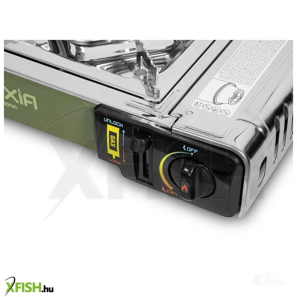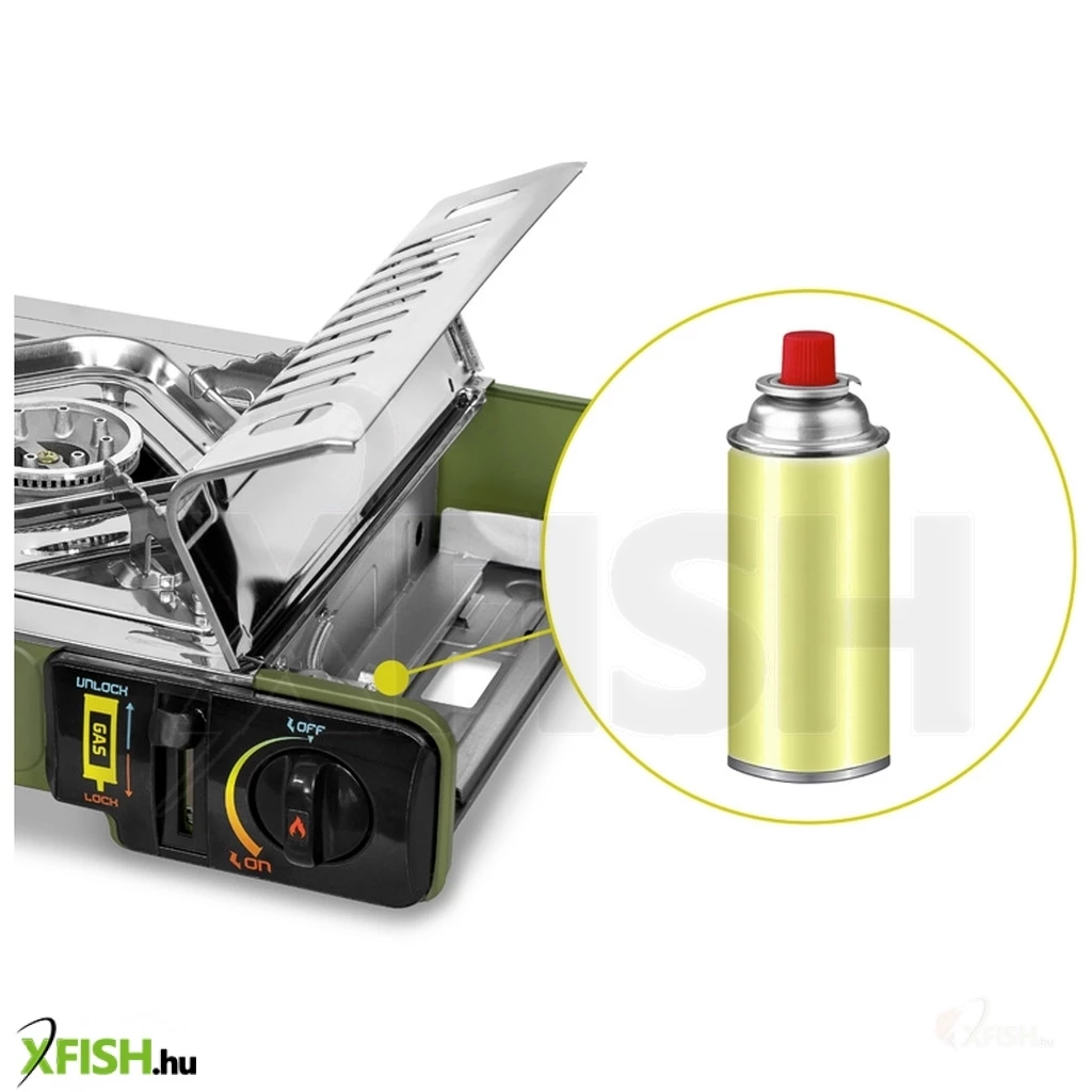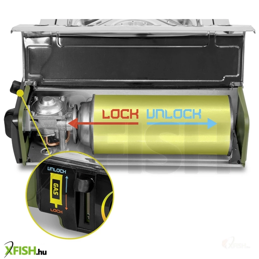 A főző CP250 típusú, 400 ml-es propán-bután gázpatronnal működik. Kétfokozatú biztonsági rendszerrel van ellátva, amely maximális biztonságot nyújt használat közben. A láng begyújtásához először rögzíteni kell a patront a főző elején található karral. Ez jelentősen csökkenti a véletlen gázszivárgás vagy automatikus kiengedés kockázatát.