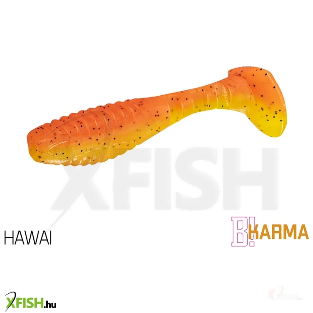 A KARMA modell tervezését kezdettől fogva nem klasszikus megoldásként választottuk a klasszikus modellhez. A cél egy sokrétű felhasználást lehetővé tevő csali megalkotása volt. Első pillantásra észreveheti, hogy a testméret és a csali farok aránya eltér a szokásostól. A csali nagyobb farka a csali atipikus mozgását okozza, ami a farok oszcillációja mellett a test gyengéd forgását is hozzáteszi, ami sérült egyed benyomását kelti. Ez a mozgás rendkívül vonzó a halak számára, és új lehetőségeket kínál a csalival való munka során. A csalitest és a farok csatlakozása között három bevágást modelleznek, amelyek hitelességet adnak a csali mozgásának. A csali teste a háton és a hason rovátkolt. Ennek két oka van. Az első a víz vibrációjának növelése. A második ok az, hogy megkönnyítsük a csali horogra helyezését. A bevágások segítségével pontosan le tudod mérni, hogy a csaliba hova kerül a horog. A jigre való felszúrás így egyszerű. A csali elülső részén a száj területén egy kivágással van módosítva, hogy a csali jobban illeszkedjen a jigfejhez.