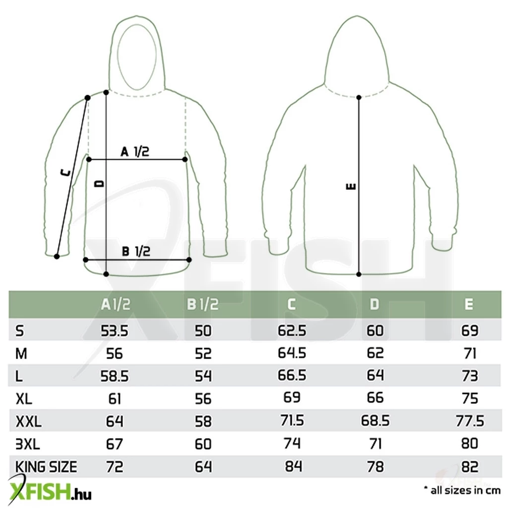 Nagyméretű kapucnival rendelkezik, széles húzózsinórral, amely szükség esetén állítható. Az ujjak végei keskenyek, és rugalmas mandzsettákkal vannak felszerelve, hogy szorosan illeszkedjenek a csukló köré. Ezenkívül a pulóver egy nagy, kétoldalas cipzárral ellátott TACKLE POCKET-tel rendelkezik, amely alkalmas horgászfelszerelések vagy olyan alapvető tárgyak tárolására, mint a telefon vagy a pénztárca. Alatta egy nagy kenguru zseb is található, amely tökéletes lehet kézmelegítésre a hideg időben. A derék része egy elasztikus pánttal is el van látva, hogy még jobban illeszkedjen a testhez.