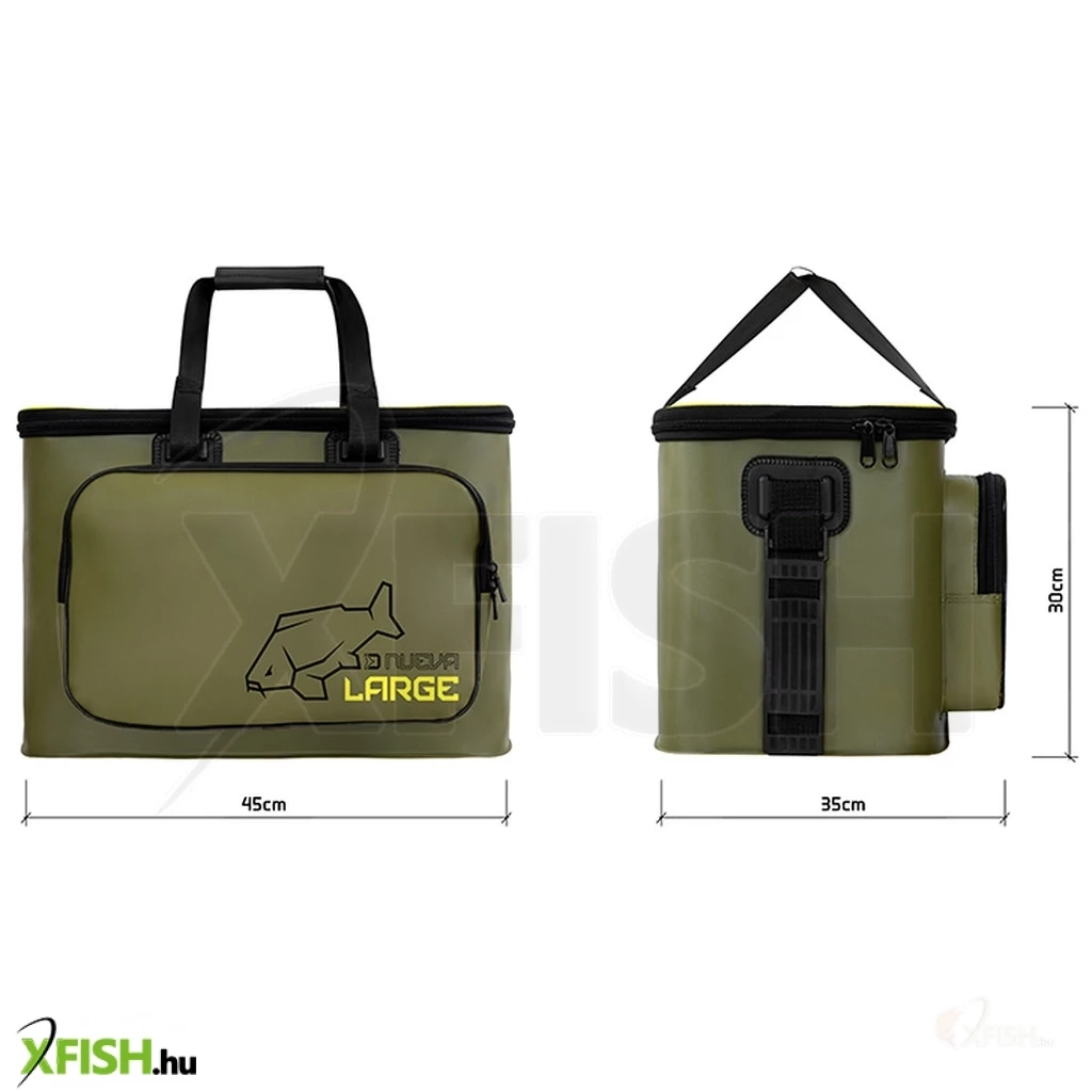 A Delphin NuEVA Large 45x30x35 cm-es horgásztáska egy EVA anyagból készült, sokoldalú táska, nagy tároló kapacitással, amit különféle horgászfelszerelések, műcsalik vagy csalik tárolására és szállítására terveztek.