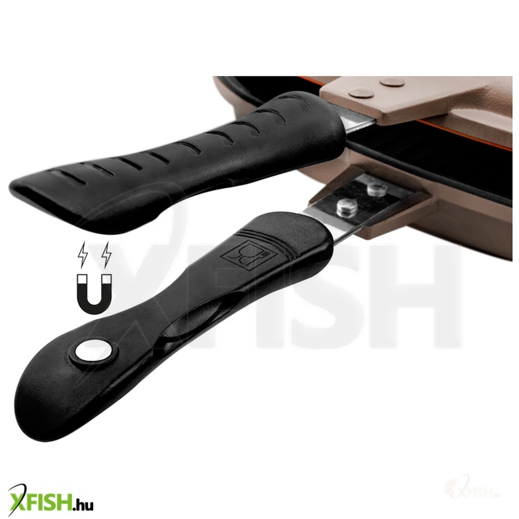 A fogantyún található mágnesnek köszönhetően az egyes felek tökéletesen összetartanak zárás után, így főzés közben tetszés szerint elforgathatja a serpenyőt. A magas hőmérsékletnek ellenálló kerületi tömítés tökéletes tömítést biztosít. A zárt edény messze legnagyobb előnye, hogy a hő sokkal gyorsabban felhalmozódik a belsejében, és nem távozik a serpenyőből főzés közben. Ez sokkal gyorsabbá és egyszerűbbé teszi az ételek elkészítését a természetben.