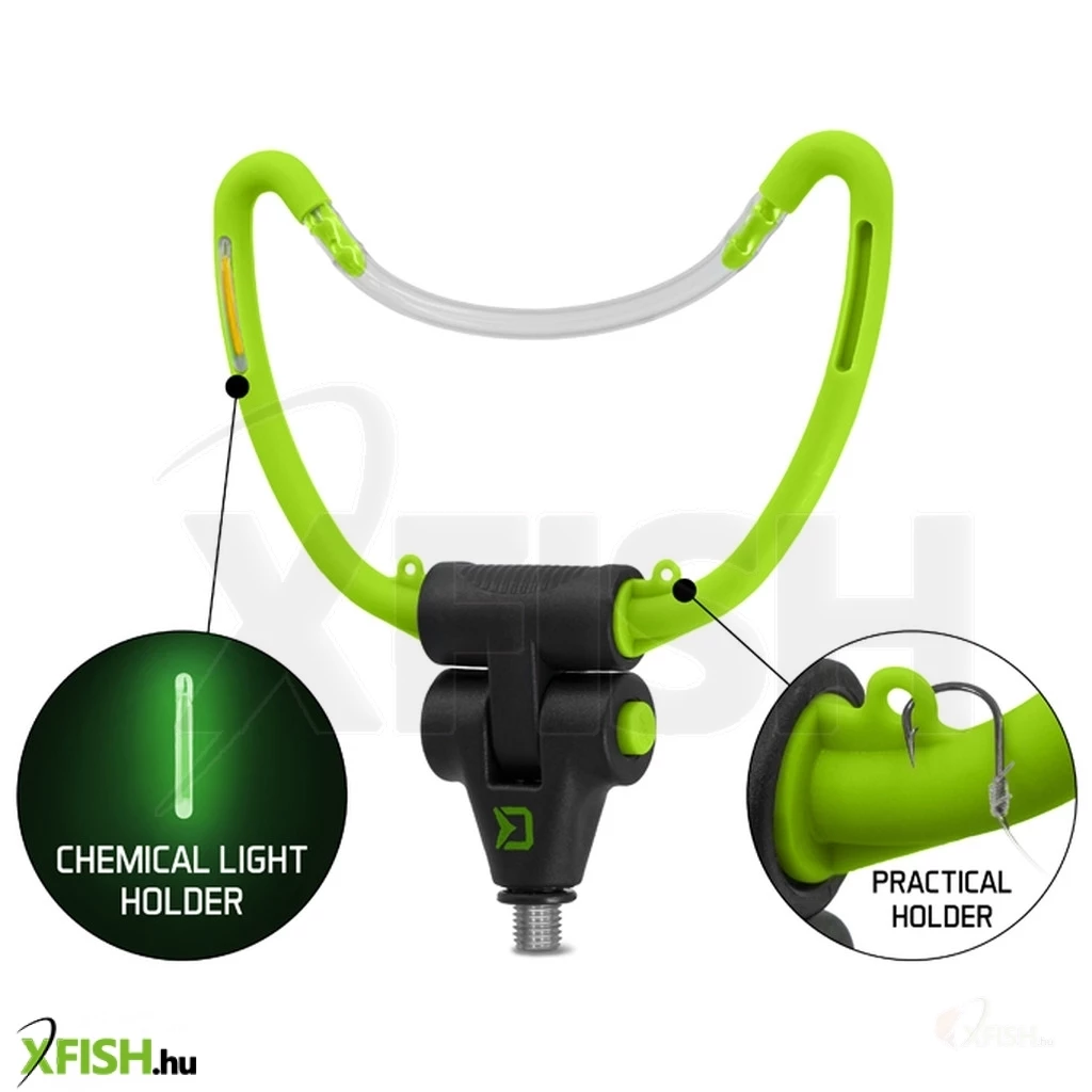 A Delphin REAXE „U” alakú tartó egy sokoldalú, megbízható és biztonságos bottartó feeder horgászoknak. Az alján található szerkezet segít a kívánt dőlésszög beállításában. 14,5 cm széles. Az etetőkosár megtöltésekor a horog rögzítésére szolgáló hurkok, a tartó hasznos kiegészítői. Ezenkívül 4 nyílással rendelkezik a világítópatronok számára, a kényelmes éjszakai horgászathoz. Univerzális menettel rendelkezik, amely kompatibilis a legtöbb leszúróval és bottartóval a piacon. A zöld és fekete szín tökéletesen passzol a REAXE feeder sorozathoz.