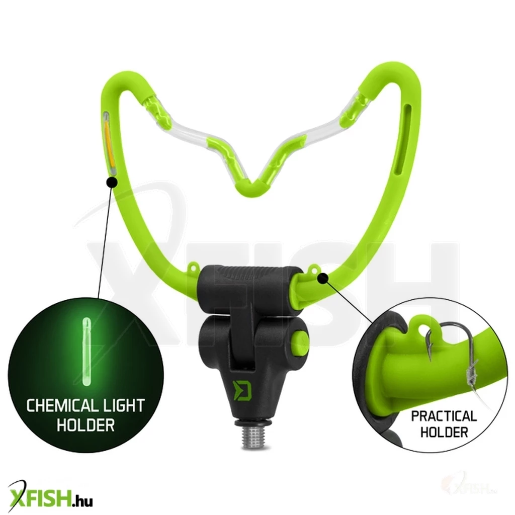 A Delphin REAXE „V” alakban egy sokoldalú, megbízható és biztonságos bottartó. Formája sima zsinórfutást garantál kapás esetén. Az alján található mechanizmus segít a kívánt dőlésszög beállításában. 14,5 cm széles. Az etetőkosár megtöltésekor a horog rögzítésére szolgáló hurkok, a tartó hasznos kiegészítői. Ezenkívül 4 nyílással rendelkezik a világítópatronok számára, a kényelmes éjszakai horgászathoz. Univerzális menettel rendelkezik, amely kompatibilis a legtöbb leszúróval és bottartóval a piacon. A zöld és fekete szín tökéletesen passzol a REAXE feeder sorozathoz.