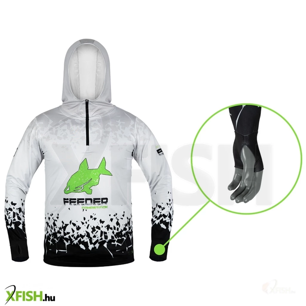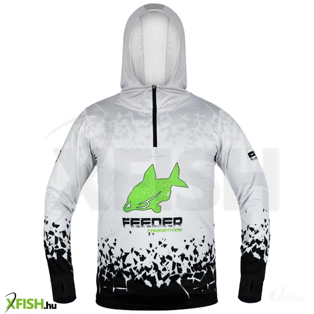 Tervezésekor figyelembe vettük azt is, hogy a melegnek leginkább kitett testrészünk a fejünk. Ez a póló jelentősen megemelt gallérral és kapucnival rendelkezik, valamint hüvelykujjlyukakkal ellátott meghosszabbított ujjakkal, ezzel fokozva kézfejünk védelmét. A kényelmes, rugalmas anyag nagy előnye, hogy gyorsan szárad, ha horgászat közben elázna.