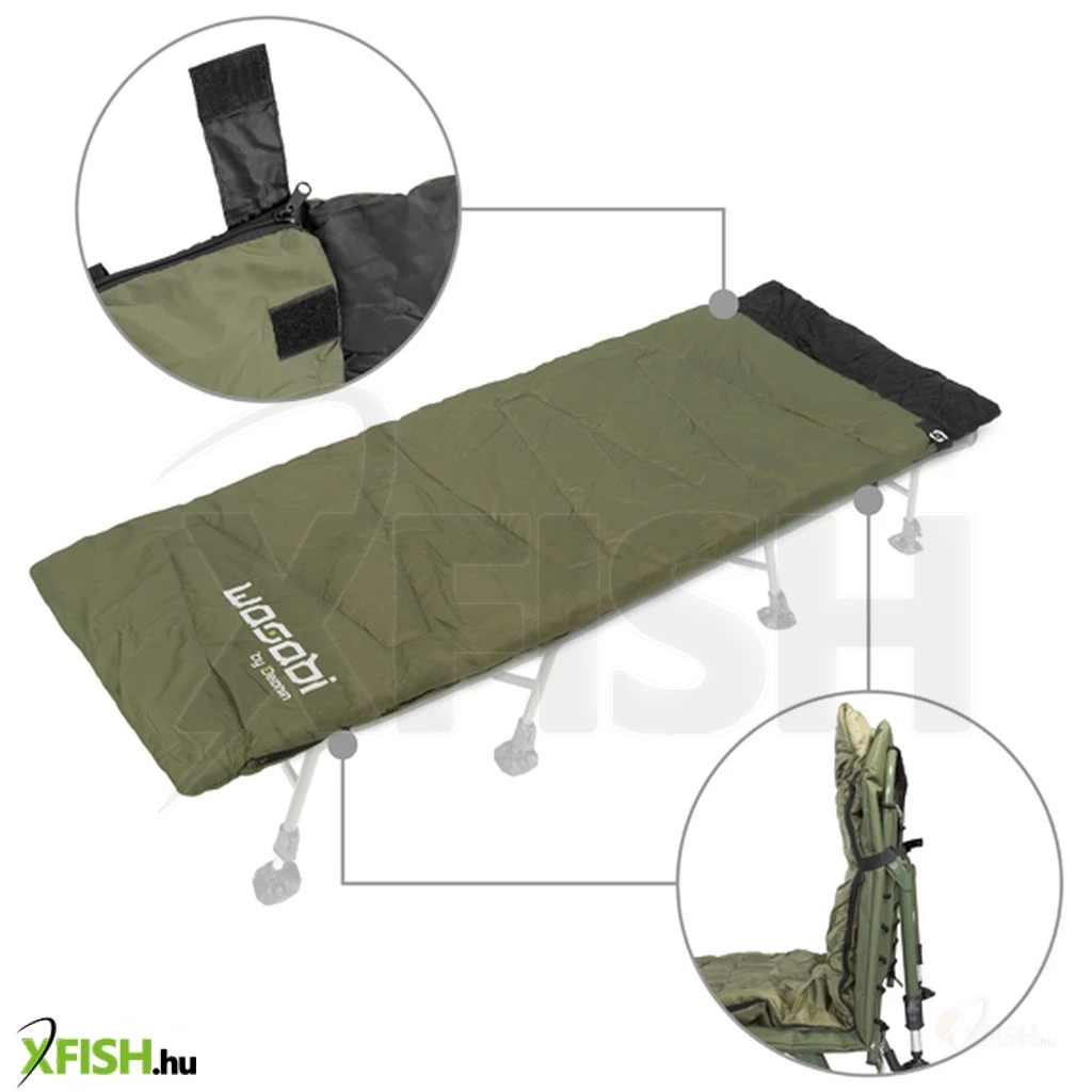 További előnye a hálózsák aljára varrt két, csattokkal ellátott heveder, amelyek megakadályozzák a hálózsák nemkívánatos megcsavarodást a horgászágyon. Ezek a praktikus és hasznos tulajdonságok kiemelik a WASABI hálózsákot a többi, hasonló árkategóriás hálózsák közül.