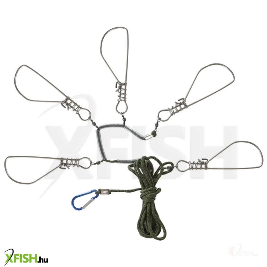 A hosszú zsinórnak köszönhetően a halakat feldolgozásukig élve tarthatjuk a mélyebb vízrétegekben. A biztonságos rögzítést a zsinór végén található karabiner szolgálja, melyet egy mozdulattal kattinthatunk a csónak oldalához.