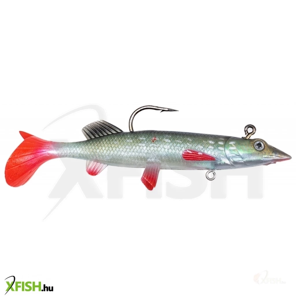 Nem is akármilyet!Speciális műcsali, melynek ólom nehezéke egybe van öntve a testet alkotó gumival, így tökéletesen együtt mozog, küllemre egységes egészet alkot. Ez sokszor a segítségünkre is lehet, hiszen a csuka legtöbb esetben a látására hagyatkozik, ha a táplálék szerzésről van szó.Kapcsunkat a fej feletti karikába akaszthatjuk, így ez is egy egyedi mozgást kölcsönöz neki. Maga a gumihal rész kellően lágy és a feltűnő, piros festések irritálják és kapásra késztetik a ragadozót.A csali hasi részén is van egy karika, amibe horgot akaszthatunk. Mivel nagyméretű a műcsali, nem biztos, hogy úgy éri a támadás, hogy az egyes horog tökéletesen meg tud akadni, ezért alulra egy plusz horgot akaszthatunk. De vigyázzunk, ezt csak ott tegyük meg, ahol akadó mentes a terület, mert csúnya beakadások részesei lehetünk az alsó horoggal.Ne ijedjünk meg a csali mérete miatt, ezt a méretet már méreten aluli csukák is megtámadják, a kapitálisak pedig csak még jobban szeretik.