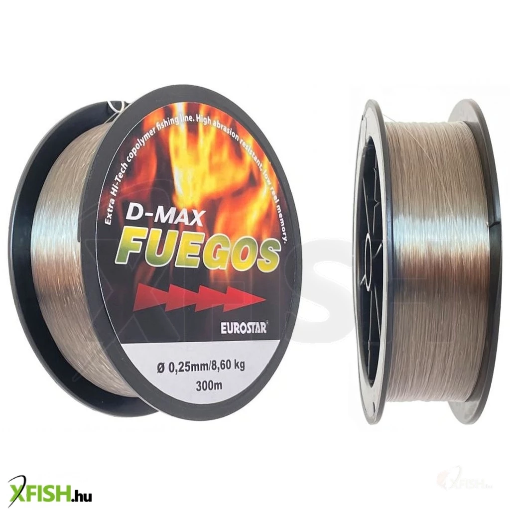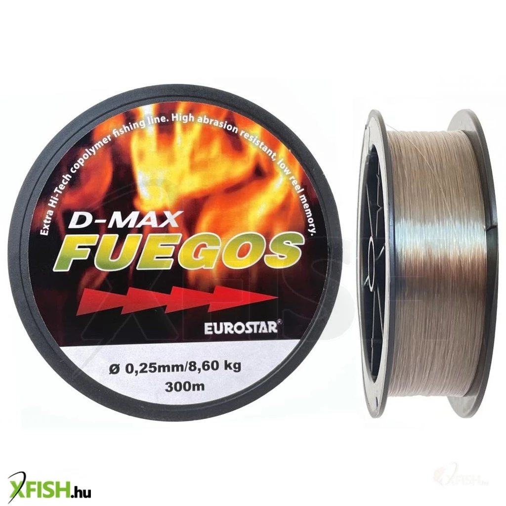 AZ EUROSTAR D-MAX FUEGOS 300m zsinór egy kiváló ár-érték arányú, általános horgászzsinór. Az elődhöz képest tovább tökéletesített zsinór amely minden mai modern követelménynek megfelel. A bevonatoknak köszönhetően UV álló és kopásálló, alacsony a nyúlása, jól köthető, jó csomótűrő. A zsinór sötét zöld színű. A pontyozó horgászat során több csomó megkötésére van szükség, ezért a kiváló csomótűrés elérése volt az egyik fő szempont. Egy speciális bevonat segítségéval érte el a gyártó, hogy a csomózás helyén nem gyengül a zsinór.