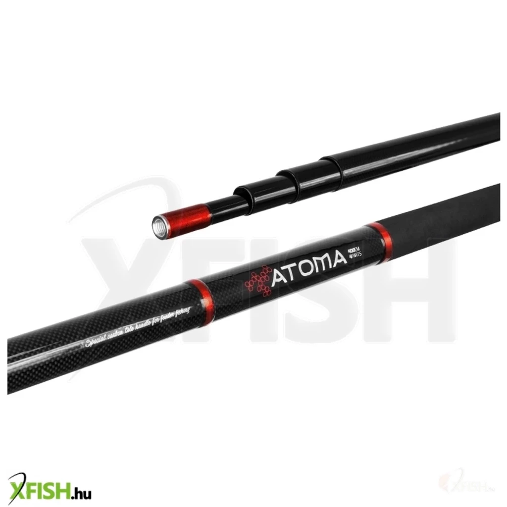 Az ATOMA egy magas minőségű karbon merítőnyél feeder merítőnyél fejekhez. A kirívó, fekete vörös kombináció a karbon szerkezettel párosítva szemet gyönyörködtető. De ez csak a kezdet. Mihelyt kezükbe fogják feltűnik az alacsony súlya, a tökéletes kivitel és az egyensúlya. A tagok a legkisebb hoba nélkül illeszkednek egymásba. A végén lévő menet feltűnő vörös cérnával van átszőve. Ez a menet univerzális és kompatibilis a legtöbb kapható merítő fejjel. A nyél része csúszásálló shrink tube felülettel van ellátva kétszínű kivitelben. Az ATOMA anyag szállító tasakban van szállítva ami szintén emeli az értékét. Ez a merítő nyél meghódít minden horgászó atomot a testében!