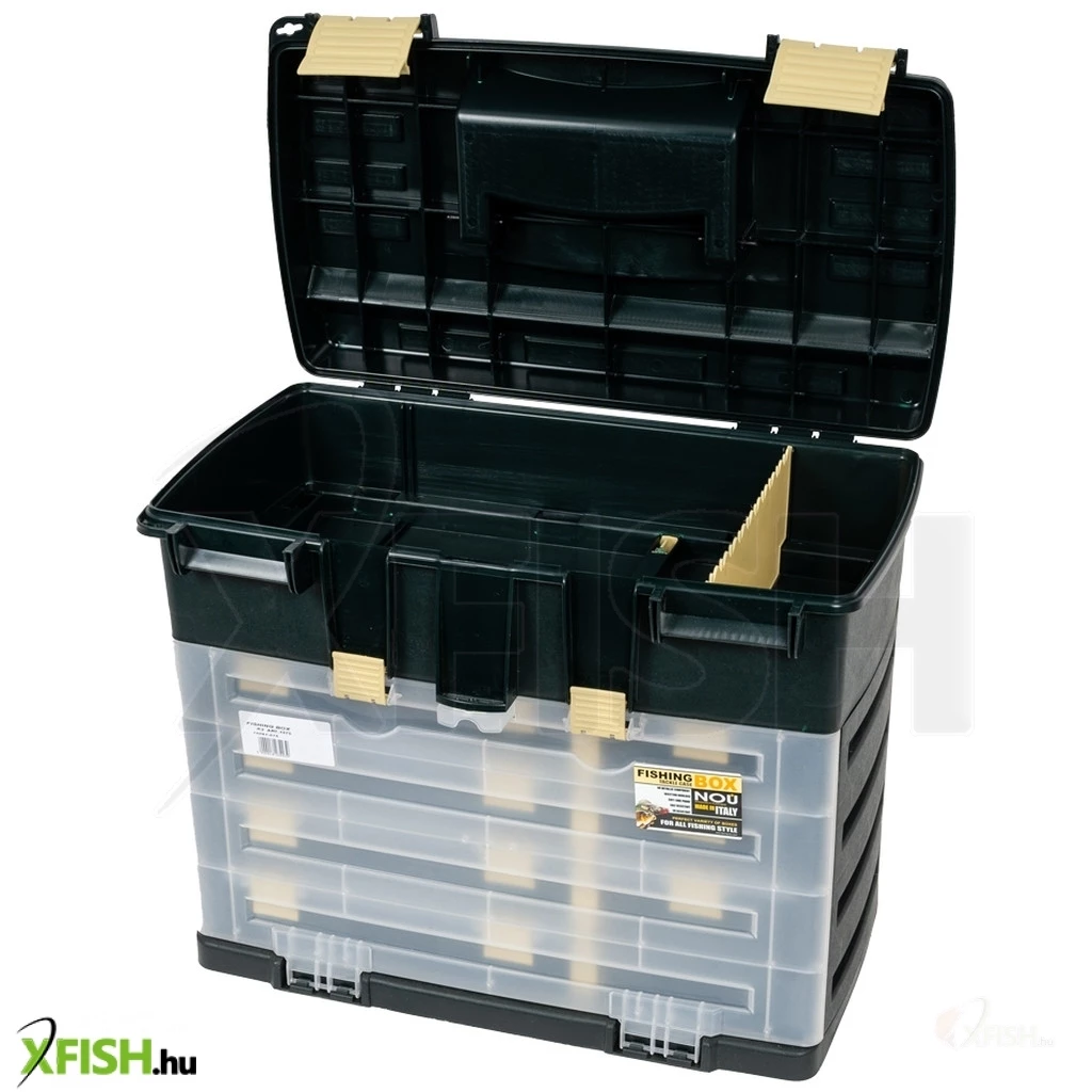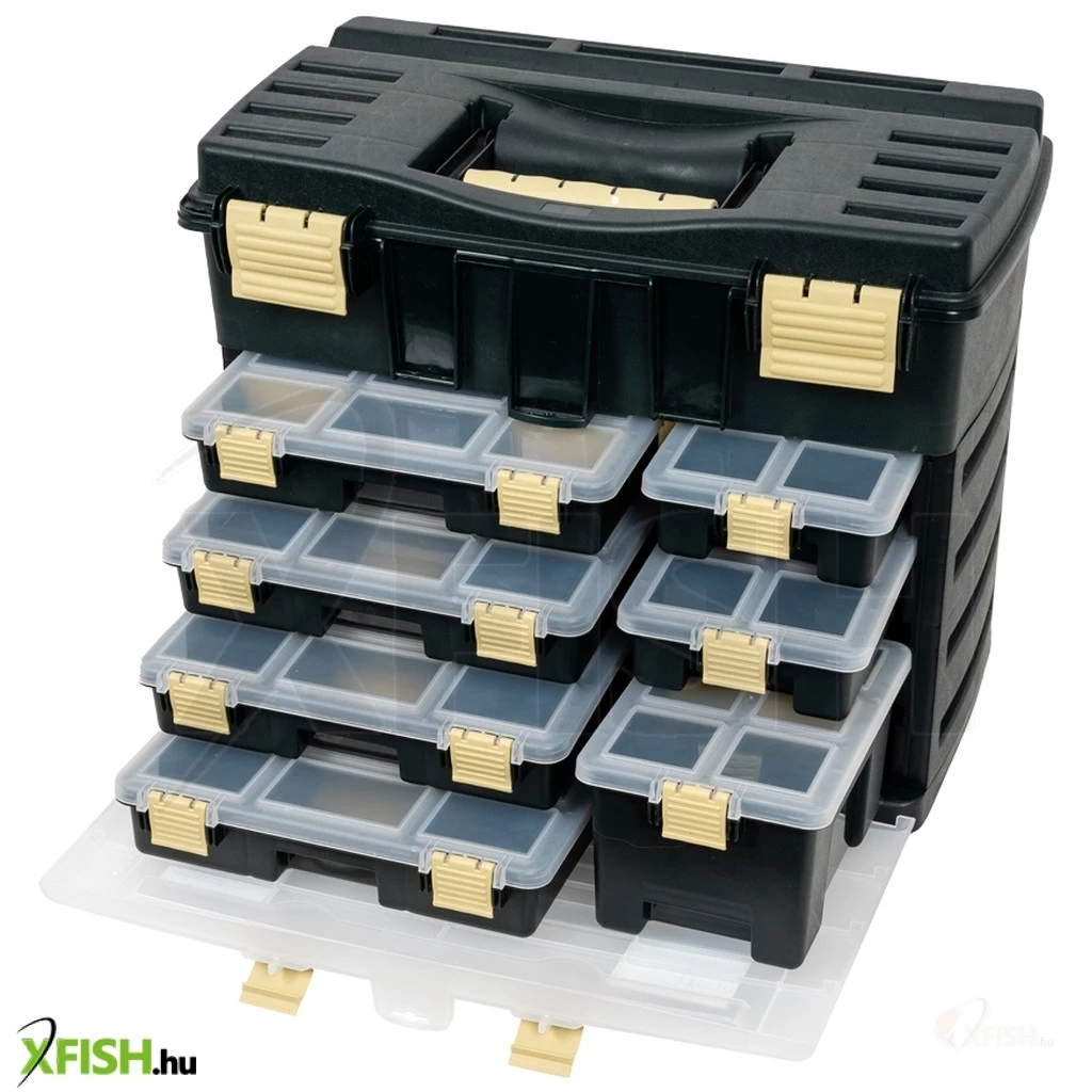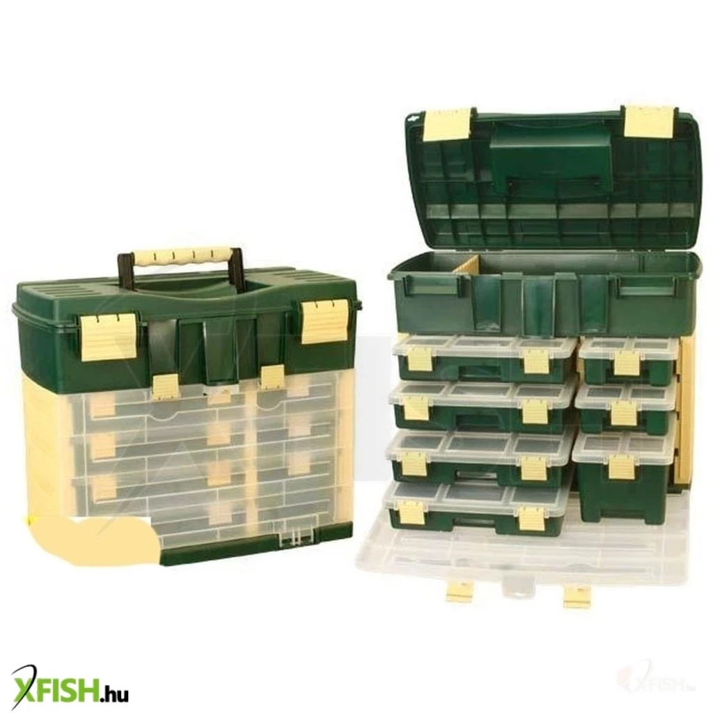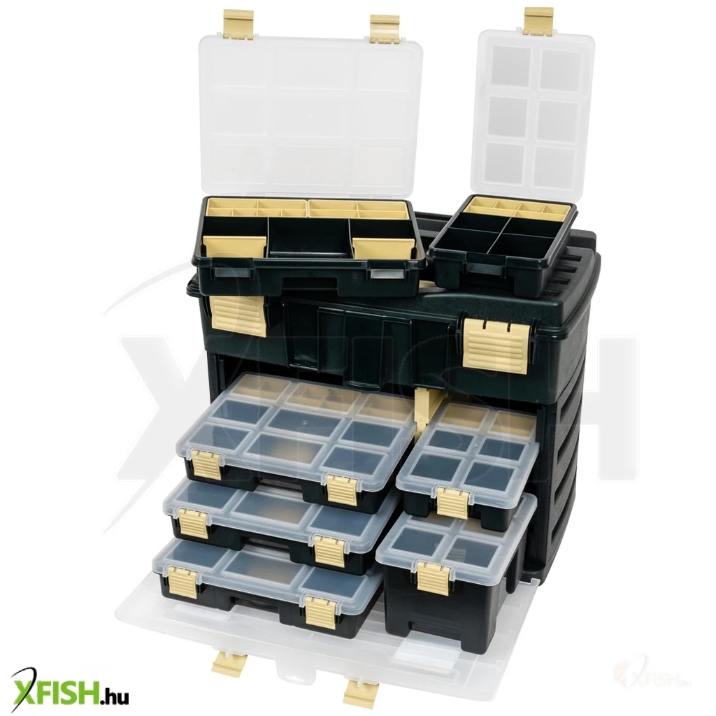 Felül nagyméretű tároló rész, alul 3 féle, összesen 7 darab kisebb doboz található: 4 db Fishing Boksz 374 (29x23x6 cm). A 9 részre osztott belsőben 2 db (8x13x5,5 cm) válaszfallal további 2-2 részre bontható, 1 db (10x13x5,5 cm) egybefüggő és 6 darab kisméretű fakk található. Ez utóbbiak felett 2 db (6,3x13x2,6 cm) kiemelhető tálca teszi még praktikusabbá. 2 db Fishing Boksz 373-as doboz (16x23x6 cm), mely 4 db nagyobb (6,5x5,8x5,5 cm) és két kisebb rekesszel készül. A kisebbek felett kiemelhető tálca található (6,3x13x2,6). 1 db Fishing Boksz 375-ös doboz (16x23x12 cm), mely jól pakolható egyterű belsővel és kiemelhető tálcával (6,3x13x2,6 cm) láttak el a gyártók.