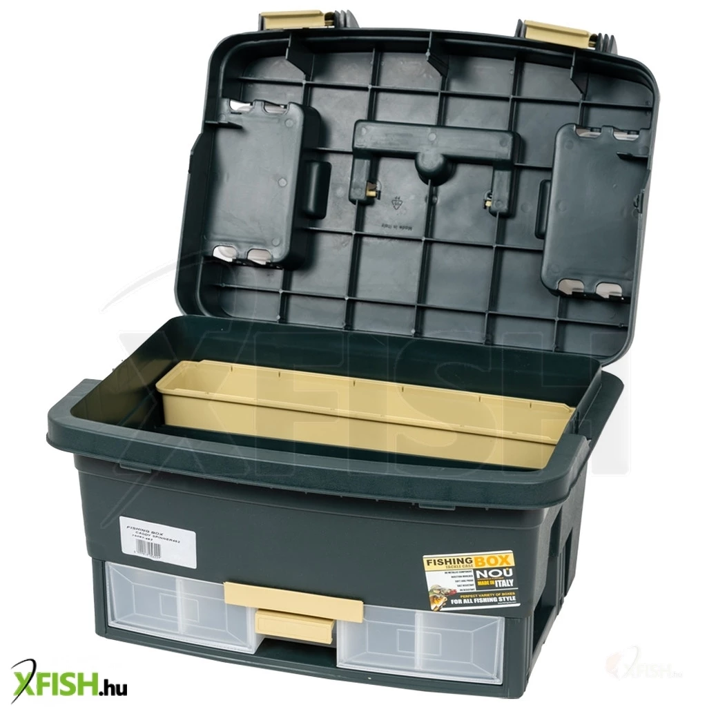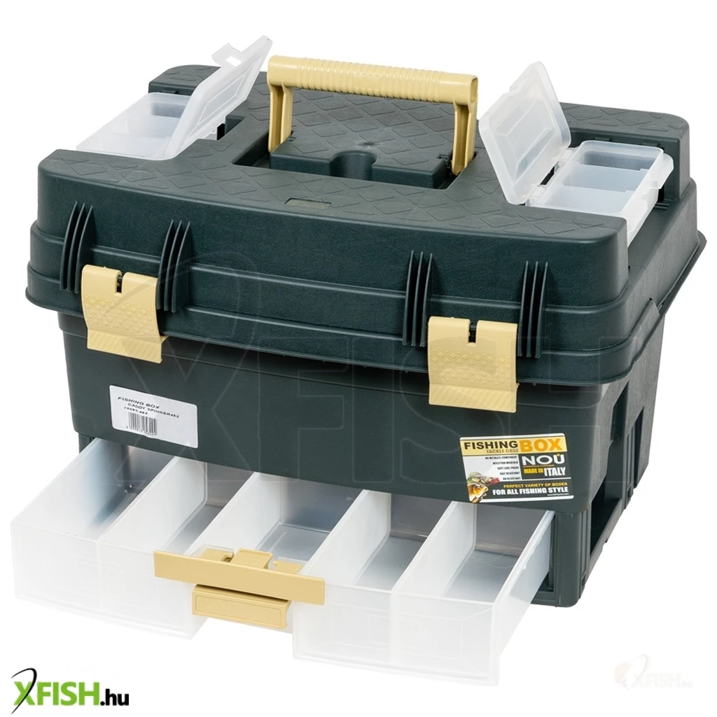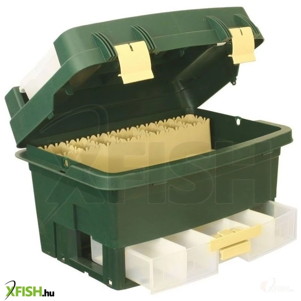 Speciális kialakítású nagyméretű pergetőláda. Ha az erős patentzárral ellátott tetőt felemeljük, egy speciális műcsali tároló rekeszt találunk. Előnye, hogy a wobblereket, villantókat, kanalakat, twistereket, "fejjel lefelé", azaz a hármas horognál lógatva tároljuk. Az eredmény kiváló! Rendezett sorokban, áttekinthetően sorakoznak egymás mellett, nem kell az összeakadt horgokat kibogozni, és ami a leglényegesebb, hogy egy mozdulattal kiemelhetjük a választott műcsalit. A láda egy speciális műanyagból készült, kihúzható fiókkal büszkélkedhet. A legnagyobb melegben csomagolás nélkül tárolhatjuk gumihalainkat, twistereinket. Fontos ! Ezt az univerzális szerelékes ládát a mindennapi élet számos területén alkalmazhatjuk, használhatjuk. Kiválóan alkalmas szerszámok, csavarok és egyéb eszközök tárolására és szállítására.