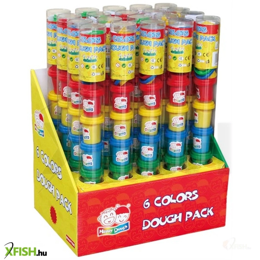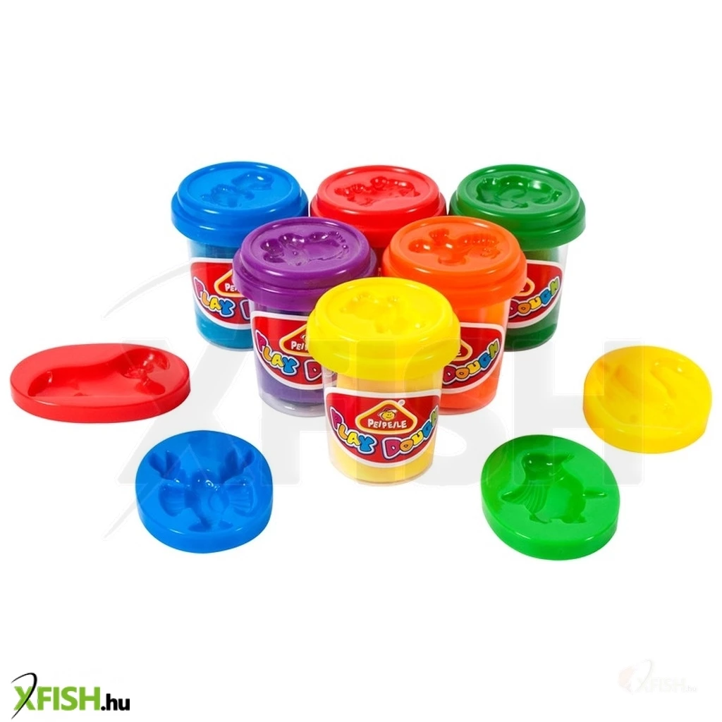 Nagy tubusokban kapható gyurma, 6 féle, különböző színű, 6 cm-es tégelyek és szaggató formák a kupakokban.