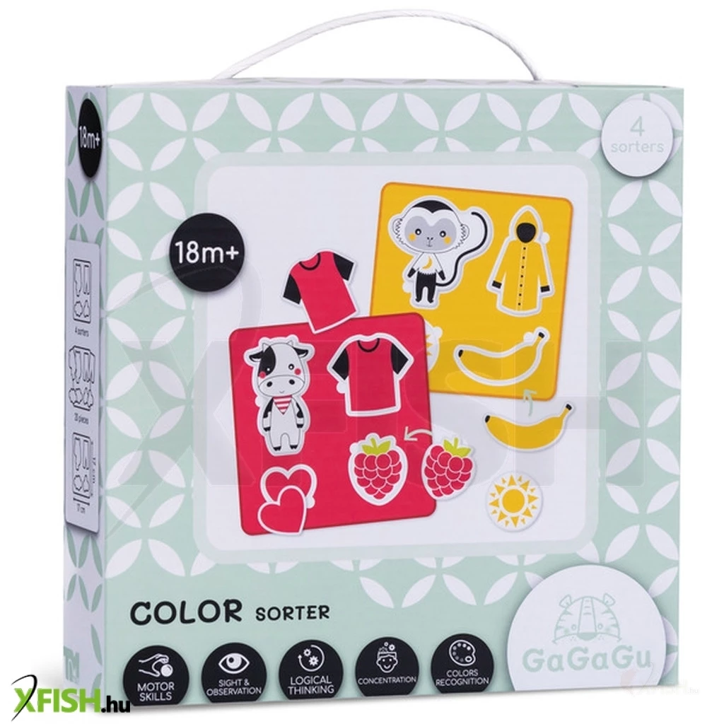 GaGaGu Színszortírozó egyedi oktató készlet, amely játékon keresztül támogatja a gyermek kognitív és motoros fejlődését. A készlet négy különböző színű táblából áll. A táblákon GaGaGu aranyos állatkáinak, különböző gyümölcsöknek és szimbólumoknak a rajzai vannak, ami segít a gyermeknek a színek, alakzatok és ok-okozati kapcsolatok felismerésében. A kis bemélyedéseknek köszönhetően könnyebb eltávolítani az egyes elemeket, így a játék élvezetessé és kielégítővé válik. A GaGaGu Színszortírozó nemcsak serkenti a gyermek látását kontrasztos színekkel és barátságos mintákkal, hanem támogatja a finom motoros készségeket (kéz és ujjmozgások) az elemek kezelésével. Az alakok illesztése segít a kéz-szem koordináció és a logikai gondolkodás fejlesztésében. Magas minőségű, biztonságos anyagokból készült, ezért tartós és biztonságos a legkisebbek számára. Könnyű és praktikus, így tökéletes választás sétákhoz, utazásokhoz vagy autóba való elvitelhez. A termék 18 hónapos kor feletti gyermekek számára ajánlott, így kiváló választás ajándéknak. A Színszortírozó a GaGaGu márkajelzés alatt kapható termékek sorozatának része, amely tartalmaz más játékokat is, mint például csörgők, érzékszervi könyvek, plüss függők, labda és érzékszervi kocka. A GaGaGu sorozat összes játékát össze lehet kötni egymással, így egységes készletet alkothatunk, amely támogatja a gyermek sokoldalú fejlődését.