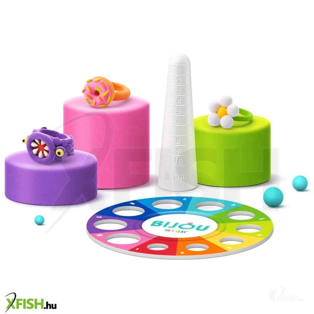 Készíts elbűvölő ékszereket a Hey Clay Bijou gyűrűkészítő gyurmaszettel, amely lehetőséget ad a gyerekeknek, hogy saját kezűleg alkossanak egyedi, csinos gyurmagyűrűket. A készlet minden szükséges eszközt tartalmaz, hogy a gyerekek desszertekkel – mint a fánk, fagyi, tortaszelet, muffin és mályvacukor – díszített gyűrűket készíthessenek. A három tégely színes, puha, könnyen formázható gyurma mellett további eszközök is segítik a gyűrűk tökéletes méretre alakítását.