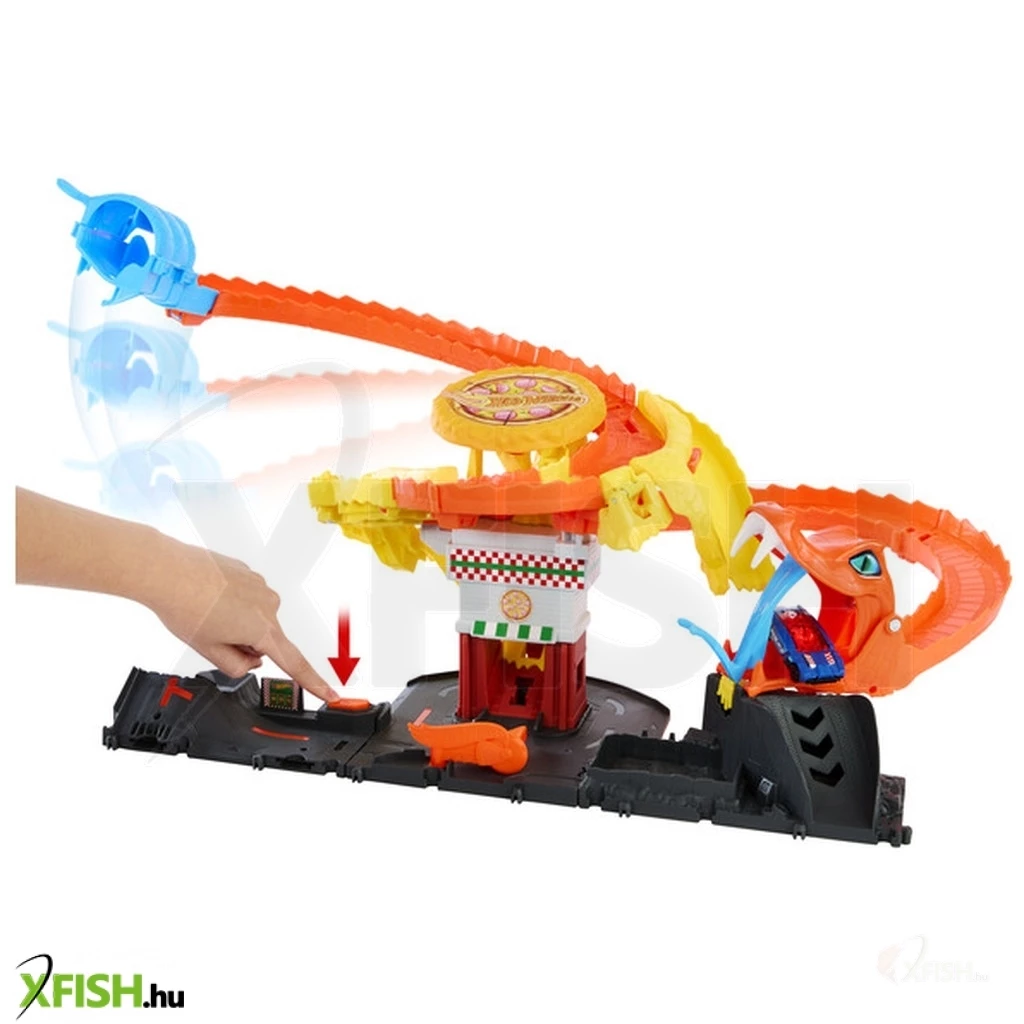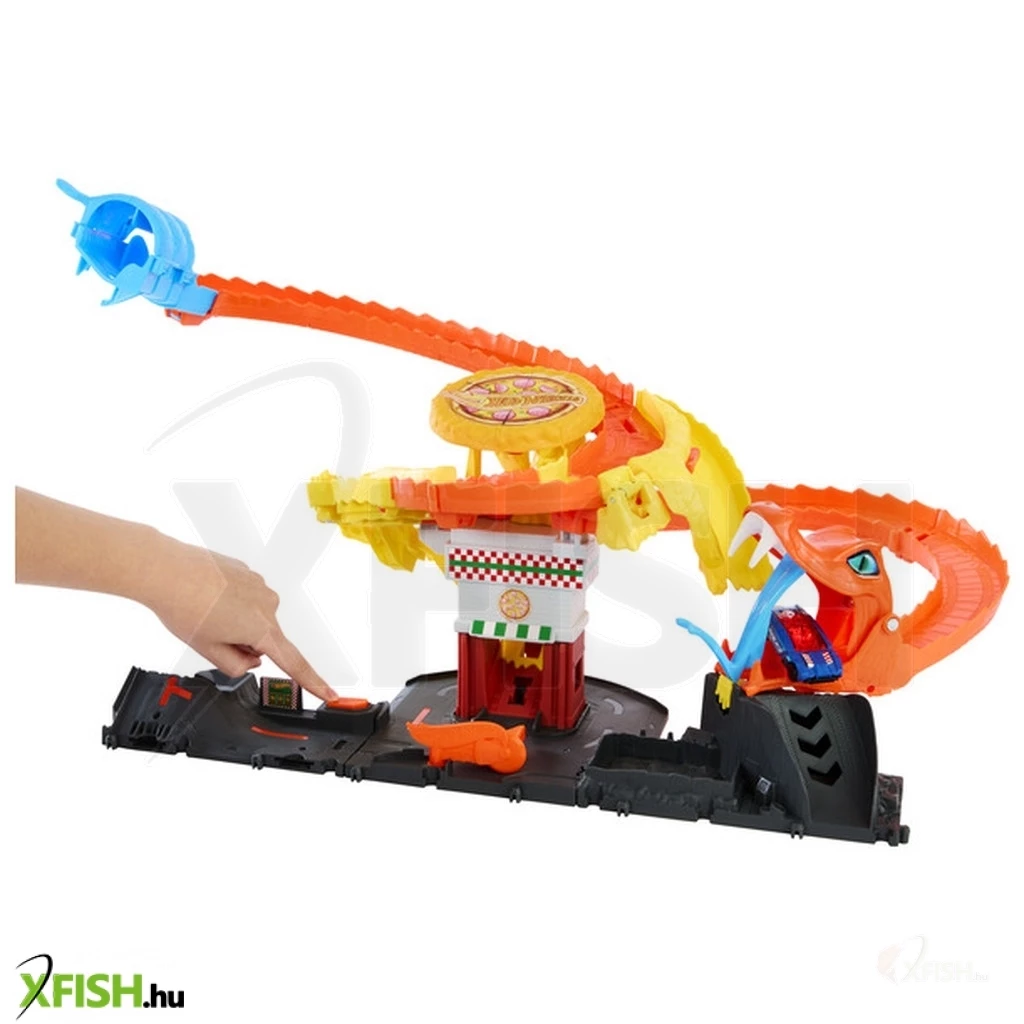 A Hot Wheels City Kobratámadás a pizzériában pályaszett egy akciódús és kreatív játékélményt kínáló Hot Wheels világ részletgazdag játékkészlet, amelyben a klasszikus kisautós száguldást egy izgalmas történet fűszerezi meg. A szett egy különleges pizzéria jelenetet tartalmaz, ahol egy hatalmas kobra váratlanul feltűnik, és a játékosoknak kell ügyesen irányítaniuk a Hot Wheels kisautót, hogy átjussanak az akadályokon, elkerüljenek veszélyes helyzeteket vagy legyőzzék a „kobratámadást”.