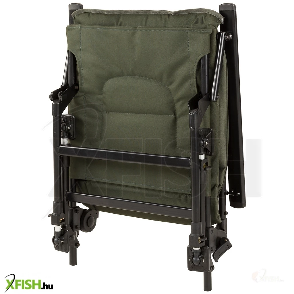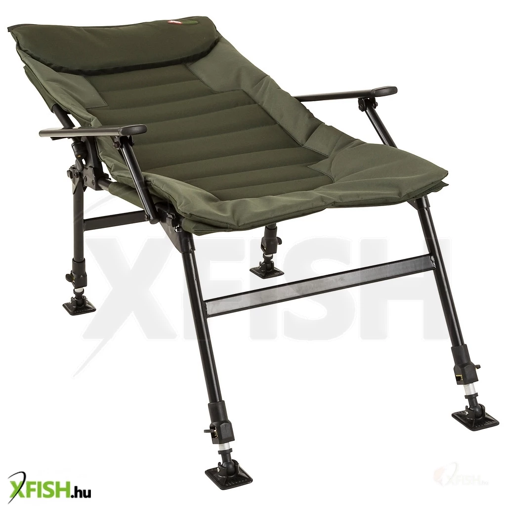 A szék ülőfelülete és háttámlája vastag szivacsbéléssel van ellátva, melyet egy strapabíró poliészter huzat borít, így hosszú időn keresztül biztosítja a maximális kényelmet. A teljesen behajtható lábak sártaposó talpakkal rendelkeznek, amelyek stabilan tartják a széket bármilyen talajon, továbbá a lábak hosszabbíthatók, hogy különböző magasságokhoz is alkalmazkodjanak. A masszív karfák további kényelmet biztosítanak, míg a szék háttámlája egy egyszerű csappantyú segítségével könnyen beállítható.
