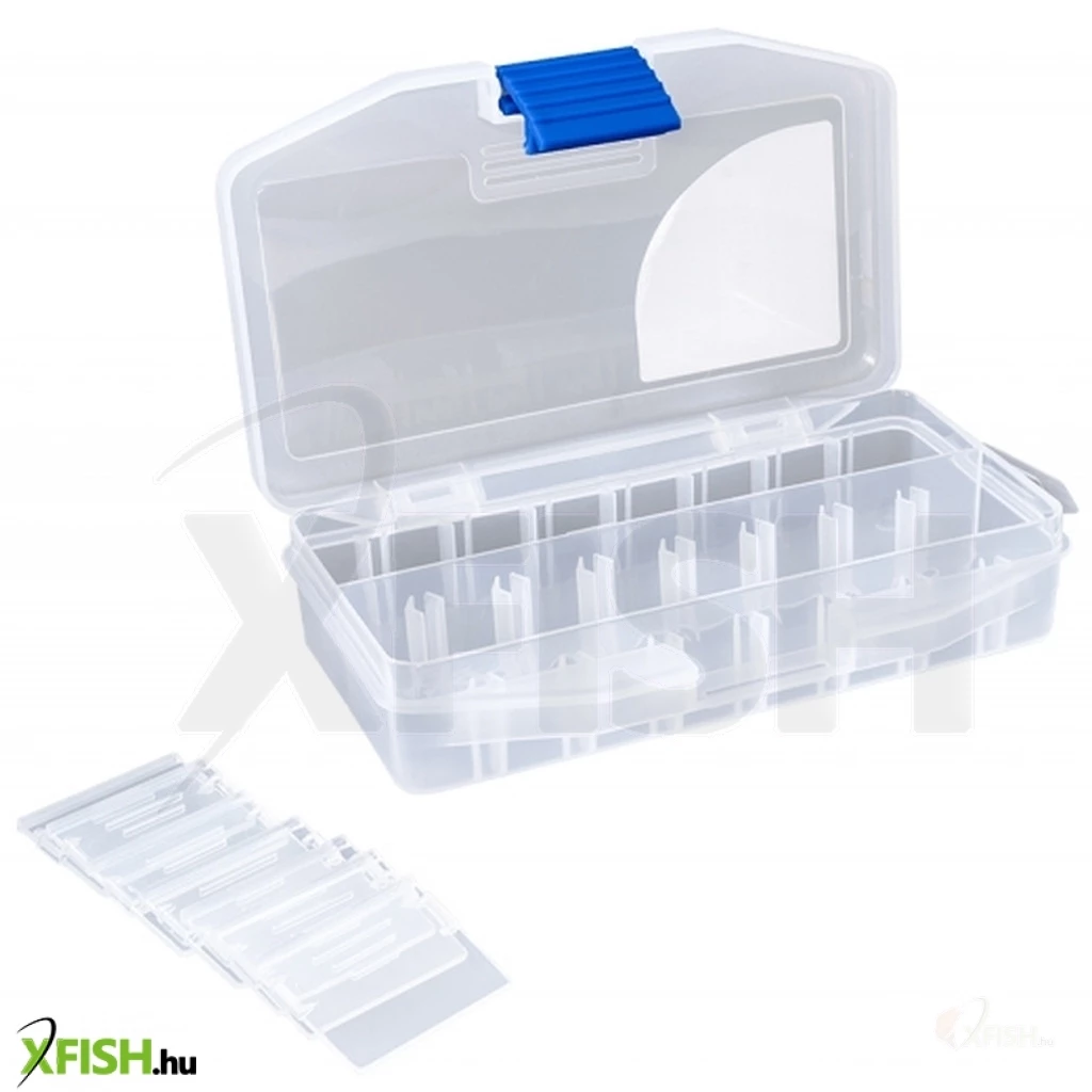 Praktikus és kis helyet foglaló horgász doboz. Belső állítható lamelláinak köszönhetően be tudjuk állítani, hogy mekkora fakkokra van szükségünk. A dobozon belül, egy fix hosszanti irányú, központi elválasztóval találkozunk. Erre merőlegesen pakolhatjuk a kis lamelláinkat, melyekkel további részekre oszthatjuk. Masszív csatja stabilan tart, nem esik szét a doboz, nem törik le a csat. Átlátszó, tehát ránézve azonnal tudjuk, mit rejt magában. Műanyagból készült, mely ellenáll a nap káros sugarainak.Tárolhatunk benne bármilyen aprócikket, horgot, forgót, gumigyöngyöket.Méretei: 13x6,5x3 cm