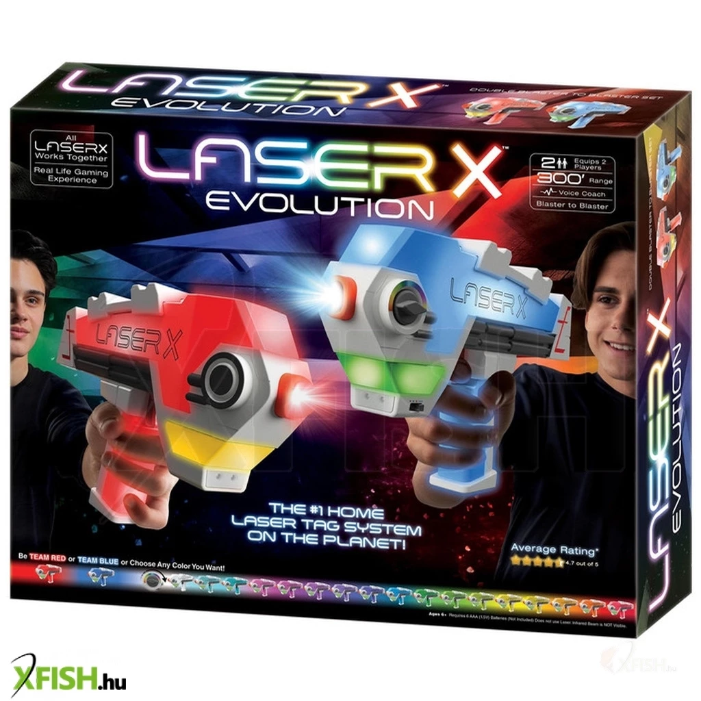 Lézercsaták otthon- Igen, mégpedig az elsőszámú otthoni lasertag rendszerrel, a Laser X Evolutionnel! A legújabb Laser-X Evolution fegyverek (Blaster) valójában nem is lézerrel hanem infravörös sugárral működnek. A hi-tech fegyverek maguk számlálják a találatokat, így nincs szükség külön vevőegységre (pl.: mellényre) sem. Hatótávolságuk 90 méter, töltésük egyszerű, és, hogy még magasabb szintre tudd emelni a fegyverkezelést, akár az interaktív edzői utasítások lehetőségével is élhetsz, angolul. Az élményt tovább fokozza a szabad színválasztás (több, mint 20 árnyalat), és a sztereo hanghatások! Játsszatok beltéren vagy kültéren, ketten vagy még többen!