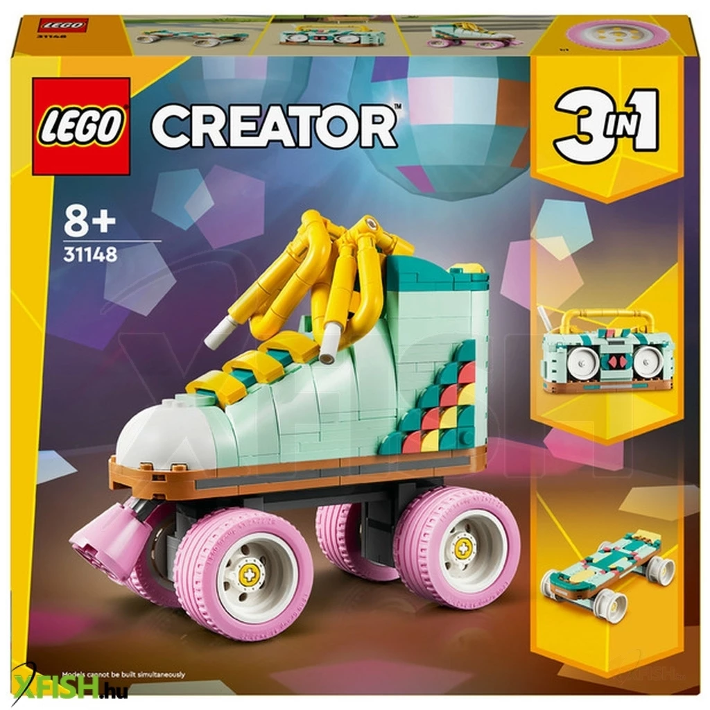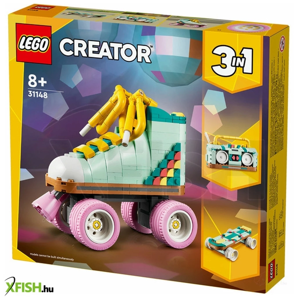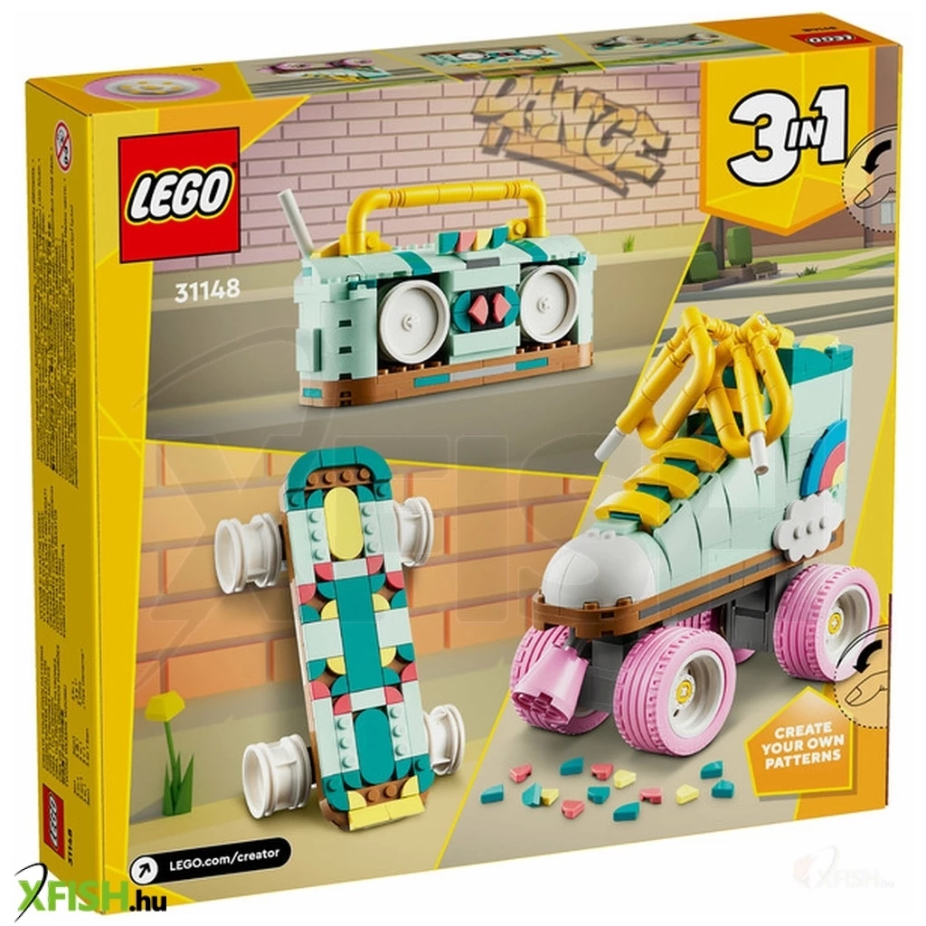 A 8 éves vagy annál nagyobb kreatív gyerekek visszautazhatnak az időben a színes Lego(R) Creator Retró görkorcsolya (31148) építőszettel. Tartalmaz egy Lego játék görkorcsolyát 4 mozgó, rózsaszín kerékkel, rózsaszín fékkel és vastag, sárga fűzőkkel,valamint számos színes elemmel, amelyekkel a gyerekek a saját elképzelésük szerint díszíthetik a csizma sarkát. Ez a Lego Creator 3 az 1-ben készlet ugyanazokkal az építőkockákkal nyújt 3 különböző építési és játékélményt a gyerekeknek. Építhetnek egy játék görkorcsolyát, majd átalakíthatják egy színes, 4 mozgó kerékkel rendelkező, minigördeszkává vagy egy kis antennával ellátott retró rádiómagnóvá. Mind a 3 modell látványos kiállítási darab lehet a gyermekeknek, miután véget értek a játékidő kalandjai. Remek ajándékok lehetnek a Lego Creator 3 az 1-ben játékok, amelyek 3 különböző modellt rejtenek egyetlen dobozban. A gyermekek imádni fogják majd a megépítést, az átépítést és az újraépítést. A 3 az 1-ben készletek hosszú órákon át boldoggá teszik a gyerekeket, és olyan modellválasztékot kínálnak, amellyel hódolhatnak a legfőbb szenvedélyeiknek, mint például a szupergyors járművek, a lenyűgöző állatok vagy a részletgazdag városi jelenetek.