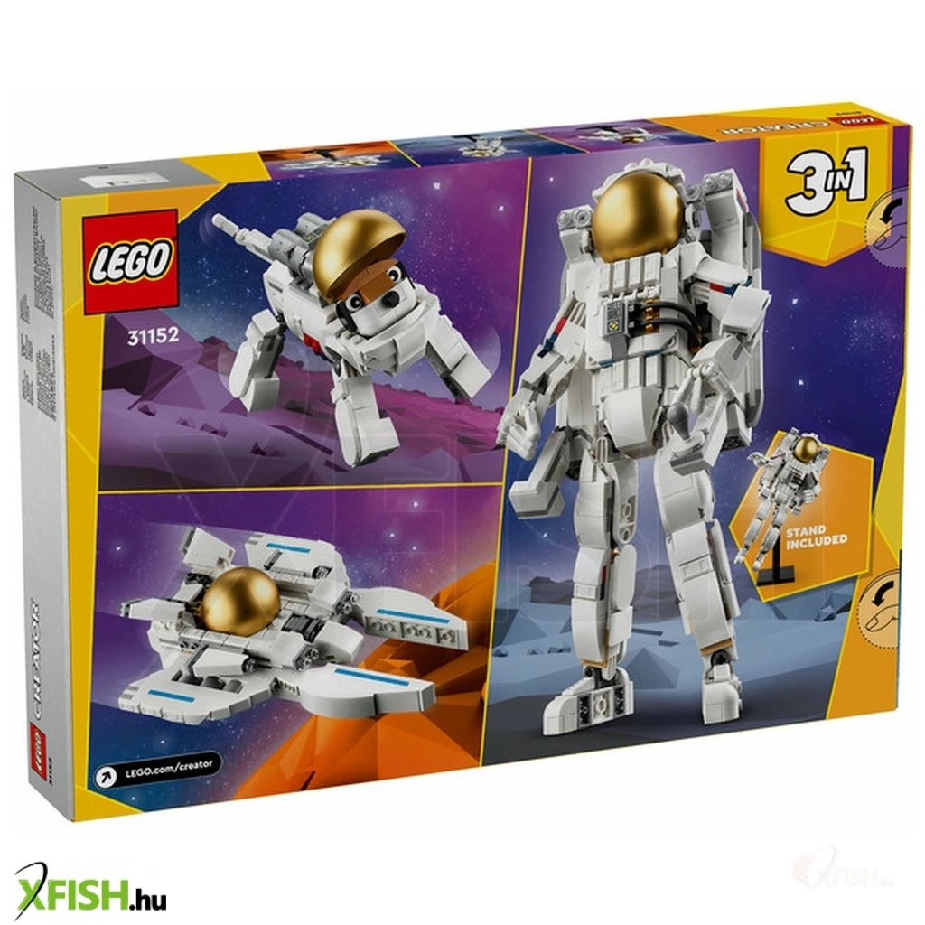 A 9 éves vagy annál nagyobb Lego(R) rajongók kilőhetik magukat a világűrbe, hogy új bolygókat fedezhessenek fel az űrbéli kalandok eljátszása közben a Lego Creator Űrhajós (31152) építőjátékkal. Az űrhajós figurához tartozik egy sugárhajtású hátizsák, egy felnyitható, arany színű sisakrostély, amelybe belehelyezhető egy minifigura (a szett nem tartalmazza), a lába, a lábfeje, a karja és az ujjai pedig mozgathatók. A fiúk és lányok 3 különböző játékszettet építhetnek meg: egy beállítható űrhajóst, egy futurisztikus űrkutyát beállítható lábakkal és farokkal, vagy egy viper jet űrhajót, amelybe belehelyezhető egy pilóta minifigura (a szett nem tartalmazza). Mind a 3 modell remek kreatív űrhajós ajándék lehet, és bemutatóállványok is tartoznakhozzájuk. Remek ajándékok lehetnek a Lego Creator 3 az 1-ben játékok, amelyek 3 különböző modellt rejtenek egyetlen dobozban. A gyerekek imádni fogják a megépítést, az átépítést és az újraépítést. A 3 az 1-ben készletek hosszú órákon át boldoggá teszik a gyerekeket, és olyan modellválasztékot kínálnak, amellyel hódolhatnak a legfőbb szenvedélyeiknek, mint például a szupergyors járművek, a lenyűgöző állatok vagy a részletgazdag városi jelenetek.