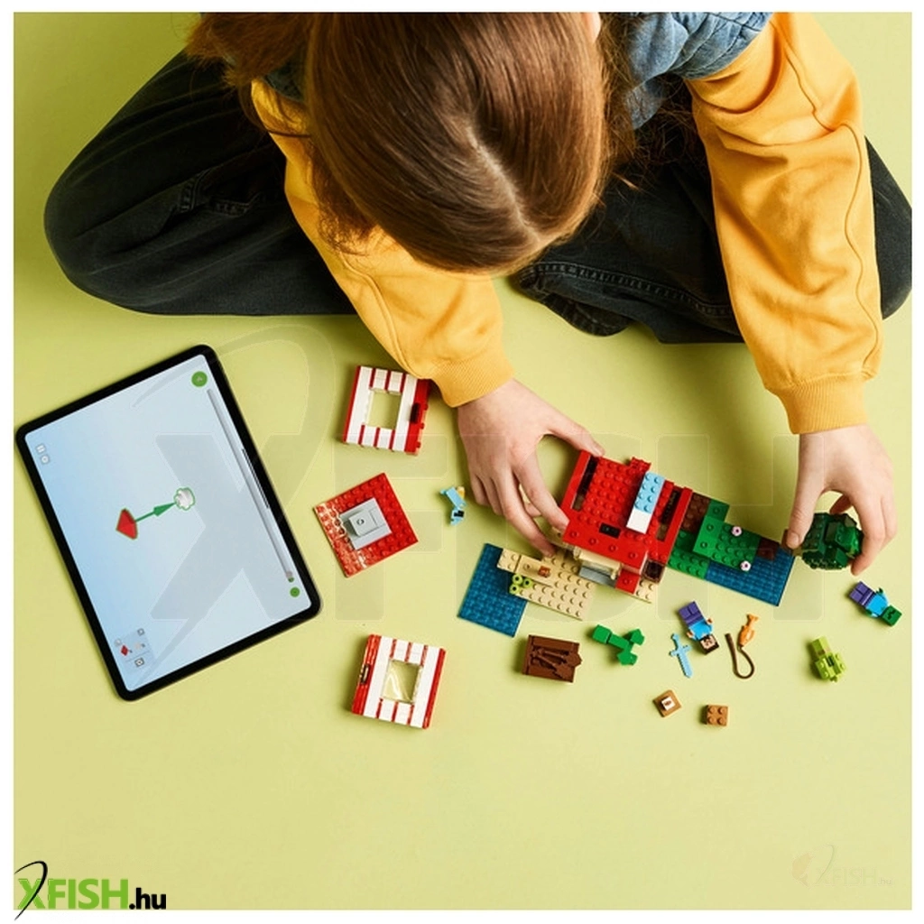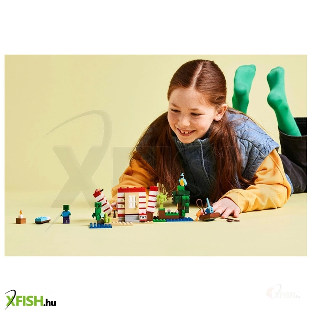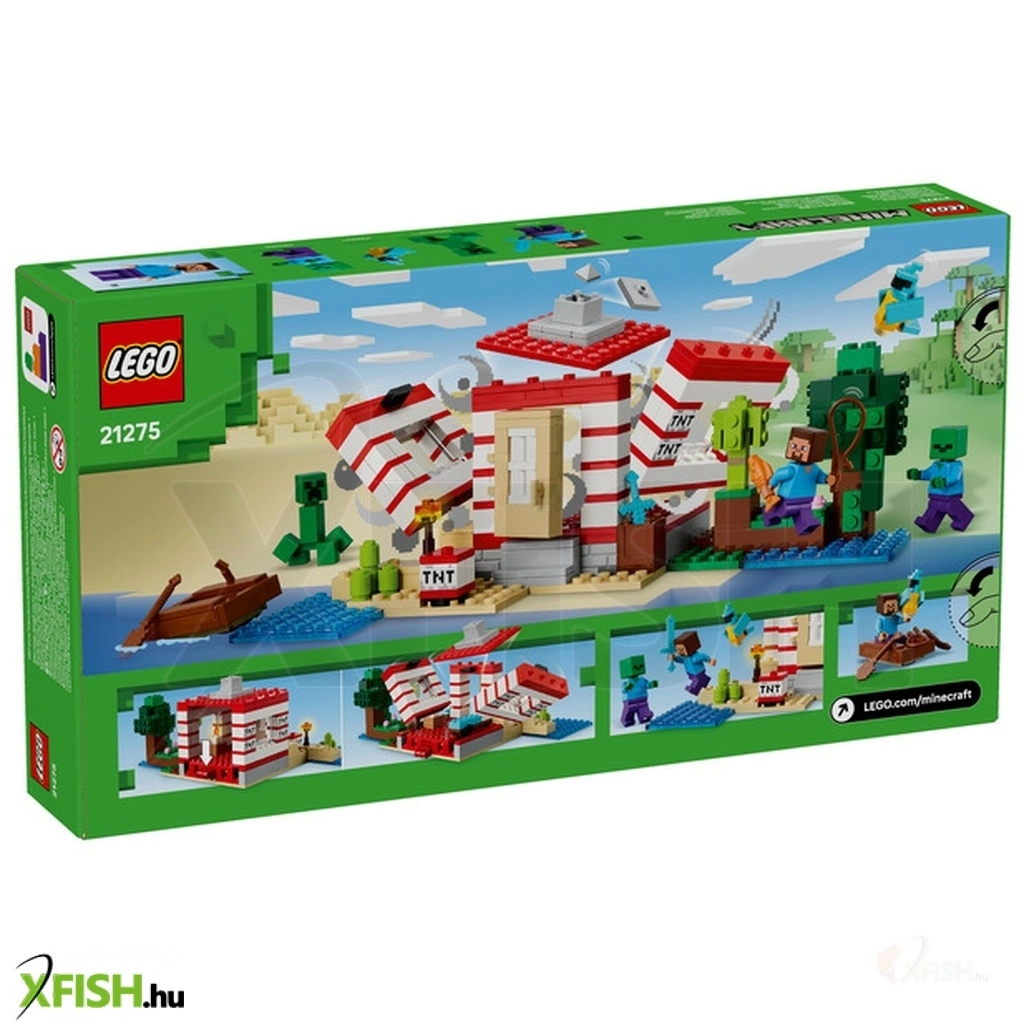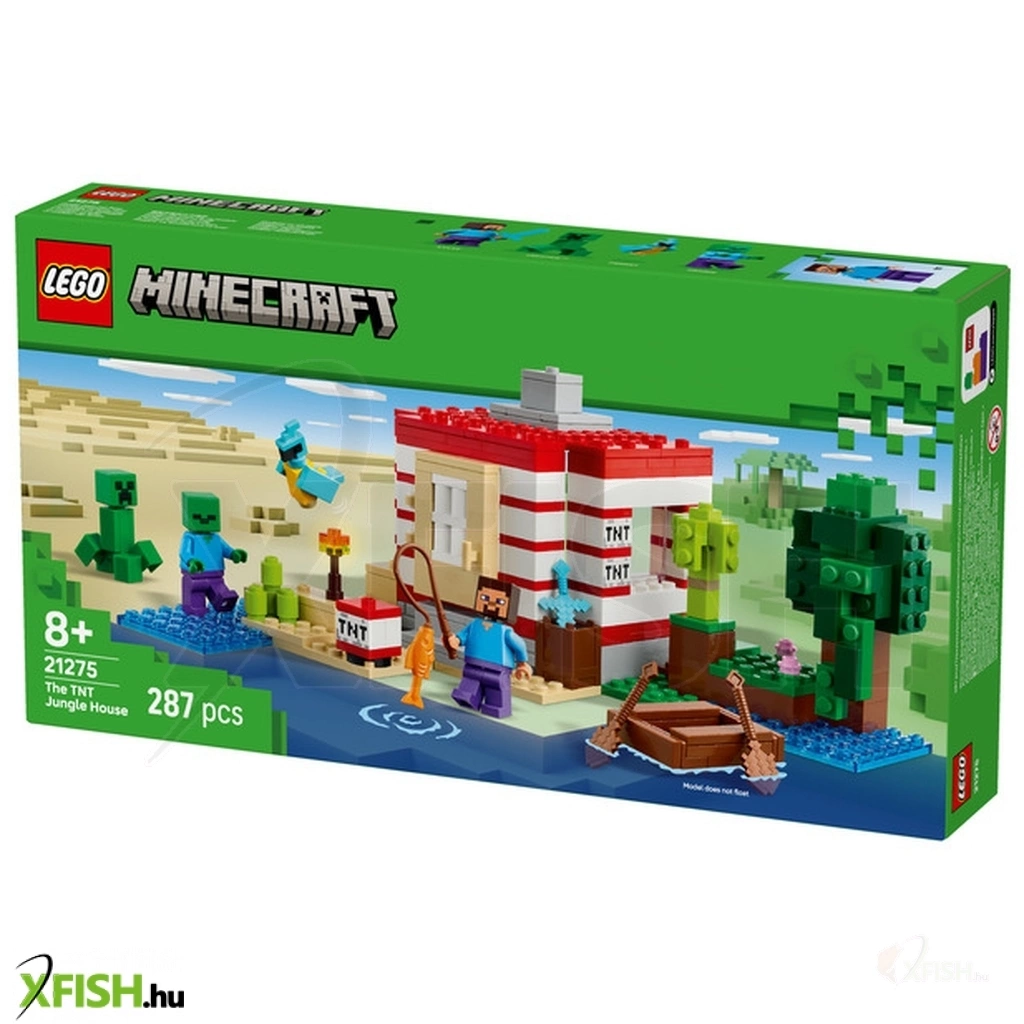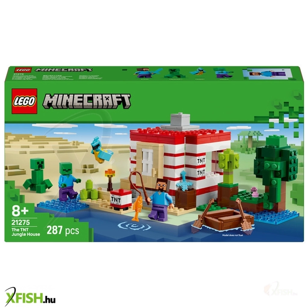 A megépíthető ház a Minecraft dzsungelbiomban található, és olyan, mintha a játék ikonikus dinamitelemének nagy méretű változata lenne. Az oldalán lévő kapcsolóval a gyerekek aktiválhatják a dinamitrobbantást, amitől az egész ház összedől. Amikor elül a por, a gyerekek újra megépíthetik a házat, hogy készen álljon a következő kalandjukra is. A fantáziadús játékot és az akciódús csatákat Steve, Creeper™ és zombi-minifigurák inspirálják. A készletben olyan autentikus Lego Minecraft kiegészítőket találsz, mint a csónak, a horgászbot, a hal, a papagáj és a dzsungelnövényzet. A Lego(R) Builder app még szórakoztatóbbá teszi a játékot, hiszen a gyerekek az eszközeik segítségével felnagyíthatják és 3D-ben elforgathatják a modelleket. A szett 287 elemből áll.