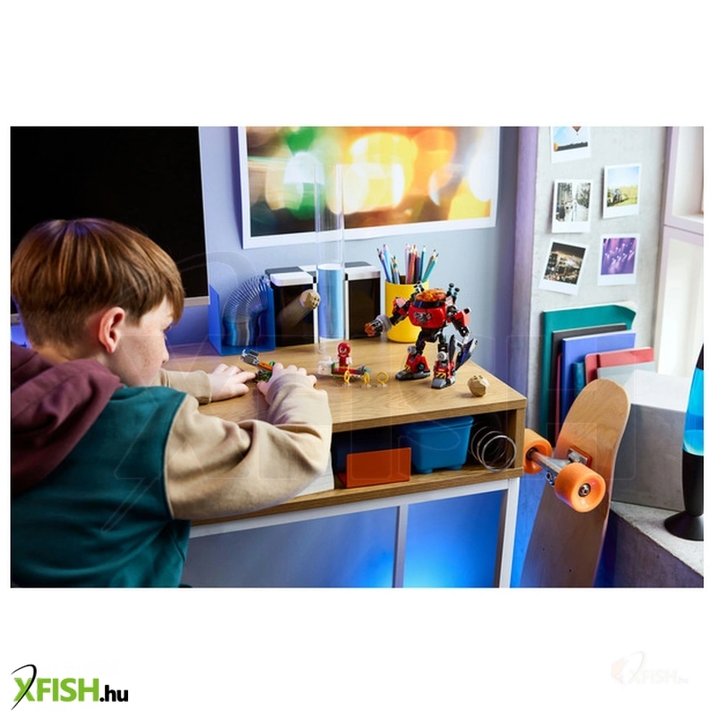 Adj lélegzetelállító kalandokat a 8 éves vagy nagyobb fiúk és lányok kezébe a Knuckles vs. Dr. Eggman Egg Crusher robotja (77005) Lego(R) Sonic the Hedgehog™ szettel, ami rengeteg jellemzővel és funkcióval bír. Ez a gamereknek szóló ajándék tartalmaz egy kézzel fogható, beállítható játék robotot, amelynek nyitható fülkéje, forgó korongkilövője (6-os) és hatalmas, forgó keze van. A robot végtagjai csuklósak, hogy interaktív legyen a játék. A gyerekek 2 karakter, Knuckles, a hangyászsün és Dr. Eggman bőrébe bújhatnak. A szett része még egy légdeszka, egy játék katapult, 2 kő, 3 aranygyűrű és 2 káoszsmaragd.
