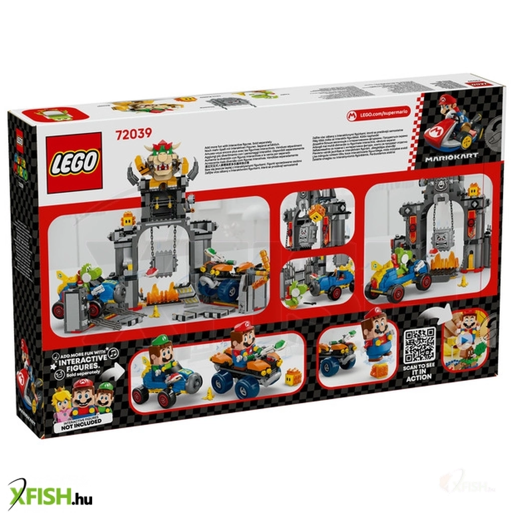 Készülj fel a versenyekre a Bowser kastélyénál ezzel a gyerekeknek készült, játék járművet tartalmazó Lego(R) Super Mario™ Mario Kart™ versenykészlettel (72039)! Ez a szett egy zseniális, Nintendo(R) karakteres ajándék 9 éves vagy nagyobb fiúknak, lányoknak és gamereknek, hiszen Bowser kastélyát tartalmazza, amelynek tetejére Bowser is felállhat, és olyan vidám funkciókkal vár, mint a kihajtható falak vagy a forgó tűzoszlop. Vezess, driftelj, és lőj teknőspáncélokat a Standard ATV-t vezető Bowserrel és a Mach 8 gokartot vezető Yoshival, törd át a kastély falát, kerüld ki a hintázó Thwompot, és döntsd fel a Lava Bubble-t! Ez az építőjáték 4 Lego Super Mario figurát tartalmaz: Bowser, Yoshi, Thwomp és Lava Bubble. Az interaktív játékhoz ültessaz autóba egy Lego(R) Mario™, egy Lego(R) Luigi™ vagy egy Lego(R) Peach™ figurát (a 71439, 71440, 71441 vagy a 72043 külön kapható szettek valamelyikéből), és idézz elő Mario Kart hang- és vizuális effekteket vezetés közben! Fedezd fel a Lego Super Mario: Ma rio Kart (külön kapható) játékszettek választékát, hogy még több jármű és figura tegye még izgalmasabbá a játékot. Ez a készlet 1068 elemből áll.