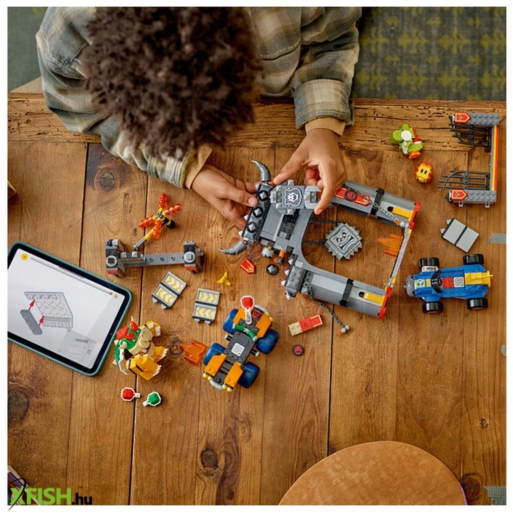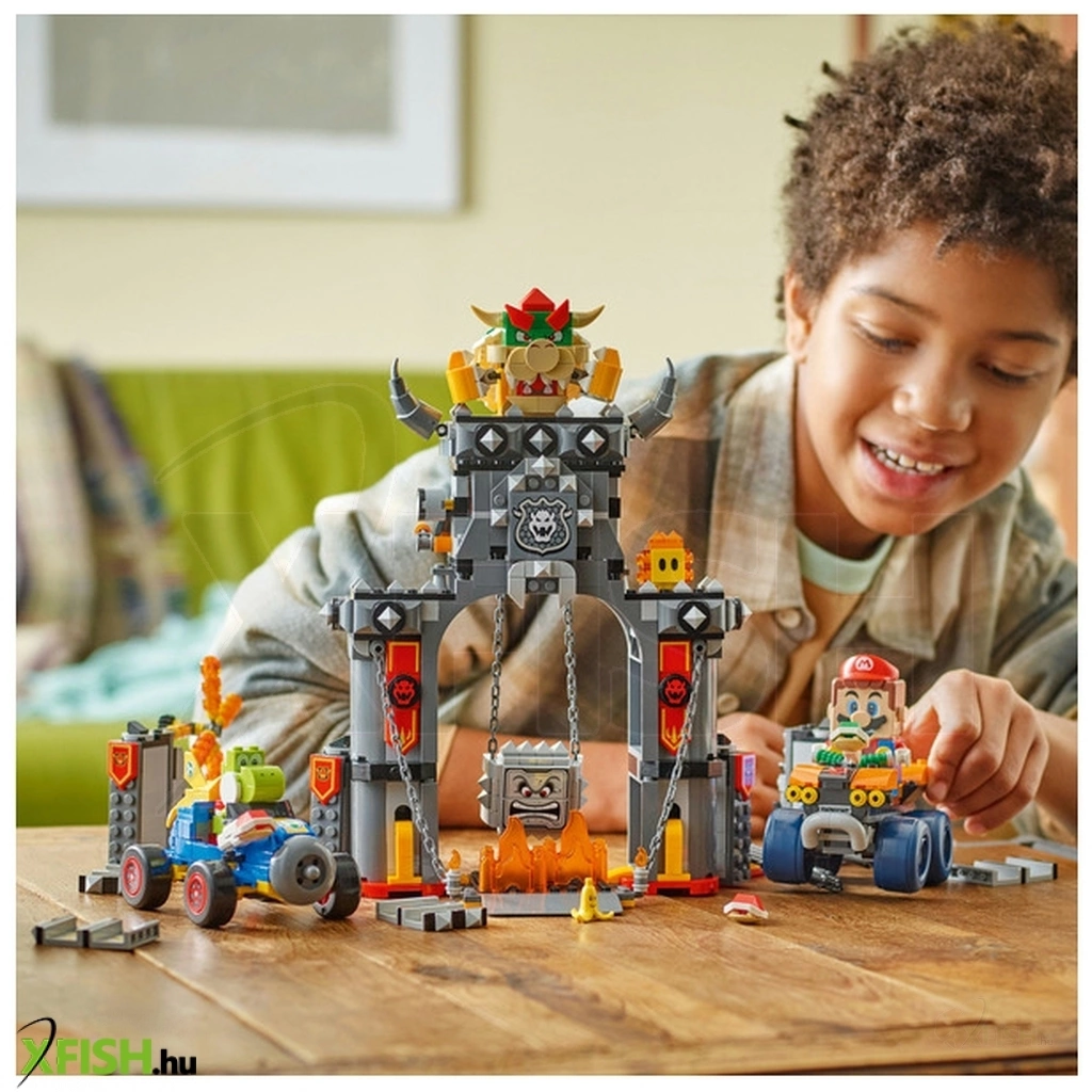 Bowser kastélya – Versenyeztesd Bowsert és Yoshit, törd át a kastély falait, és kerüld ki a lezuhanó Thwompot ebben a gyerekeknek készült, játék járművet tartalmazó Lego(R) Super Mario™: Mario Kart™ játékkészletben!