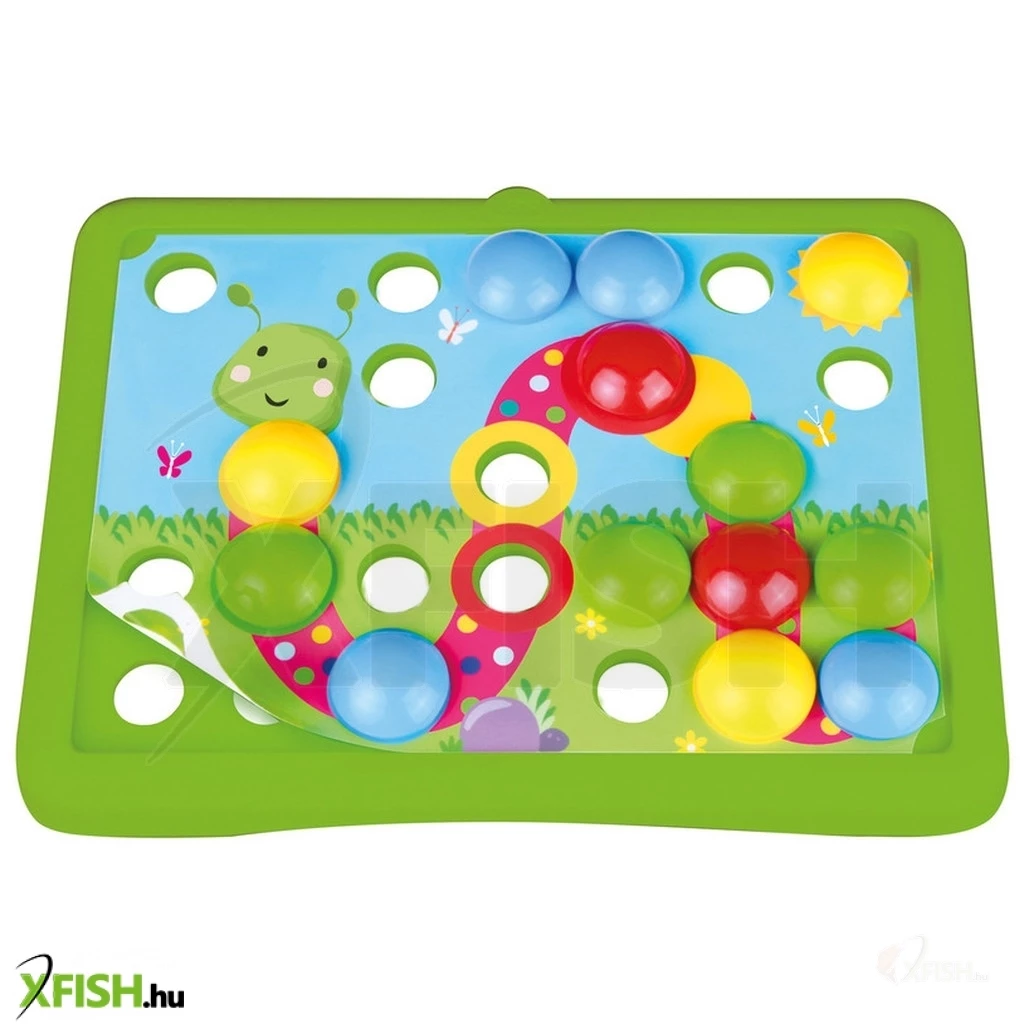 Készíts nagyszerű képeket a korongok segítségével! Az Első mozaik képkirakó játékom készlet kiváló kikapcsolódás lehet a 3-6 éves korosztály számára. A játék színes képekből áll, de várjunk csak! Mik ezek a lyukak a tábla közepén- Egészítsd ki a képet a korongok segítségével, így egy mókás mozaikképet kapsz. A 7 db színes játék kirakásával lebilincselő képeket ismerhetsz meg. A kedves kukacon, a meseszép pillangóig, a mókás gombákon át fantasztikus alkotásokat ismerhetsz meg. Rakd ki a képeket és fedezd fel a téged körülvevő világot! A játék tartalmaz egy egyszerű zöld képet is, melyre saját történeteidet készítheted el a színes korongok segítségével! Garantált mókában lesz része mindenkinek, aki szeret alkotni és kíváncsi arra a sok dologra, ami őt körülveszi. Az önfeledt játék közben pedig fejlődhet az alkotók kreativitása és problémamegoldó képessége, a képek kitöltésével. A készlet tartalmaz 36 db színes korongot, 7 db megrajzolt és az 1 db zöld képet.