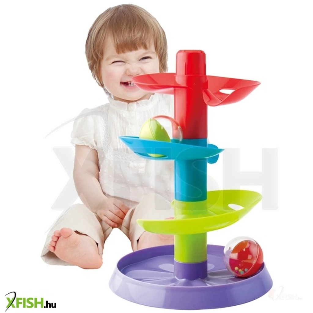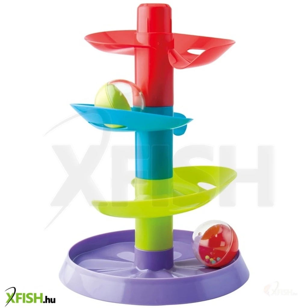 Gurítsd végig a színes golyókat a műanyag toronypályán! A kicsi golyófuttató pálya egy színes torony, amin a golyók ugrálva tudnak haladni. A golyókat a pálya tetejéről kell indítani, ami minden pályaszakaszon felgyorsul, utána lepottyan és végül a tálcában köt ki. A Golyófuttató pálya emeletenként rakható össze, a játék fejleszti a megfigyelést és a kézügyességet is.