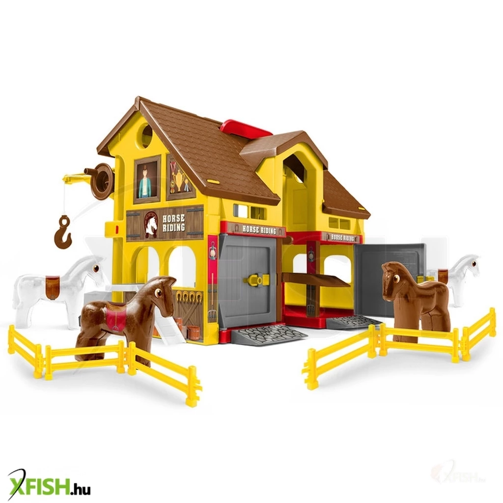 A készlet tartalmaz egy nyitható ajtóval ellátott házat (37 cm x 30 cm), egy szállítóliftet, 4 lovat, 6 lovas karámot, 2 tartályt vízhez és ételhez, akadálypályát, darut a széna szállításához, rámpákat és 34 db matricát.