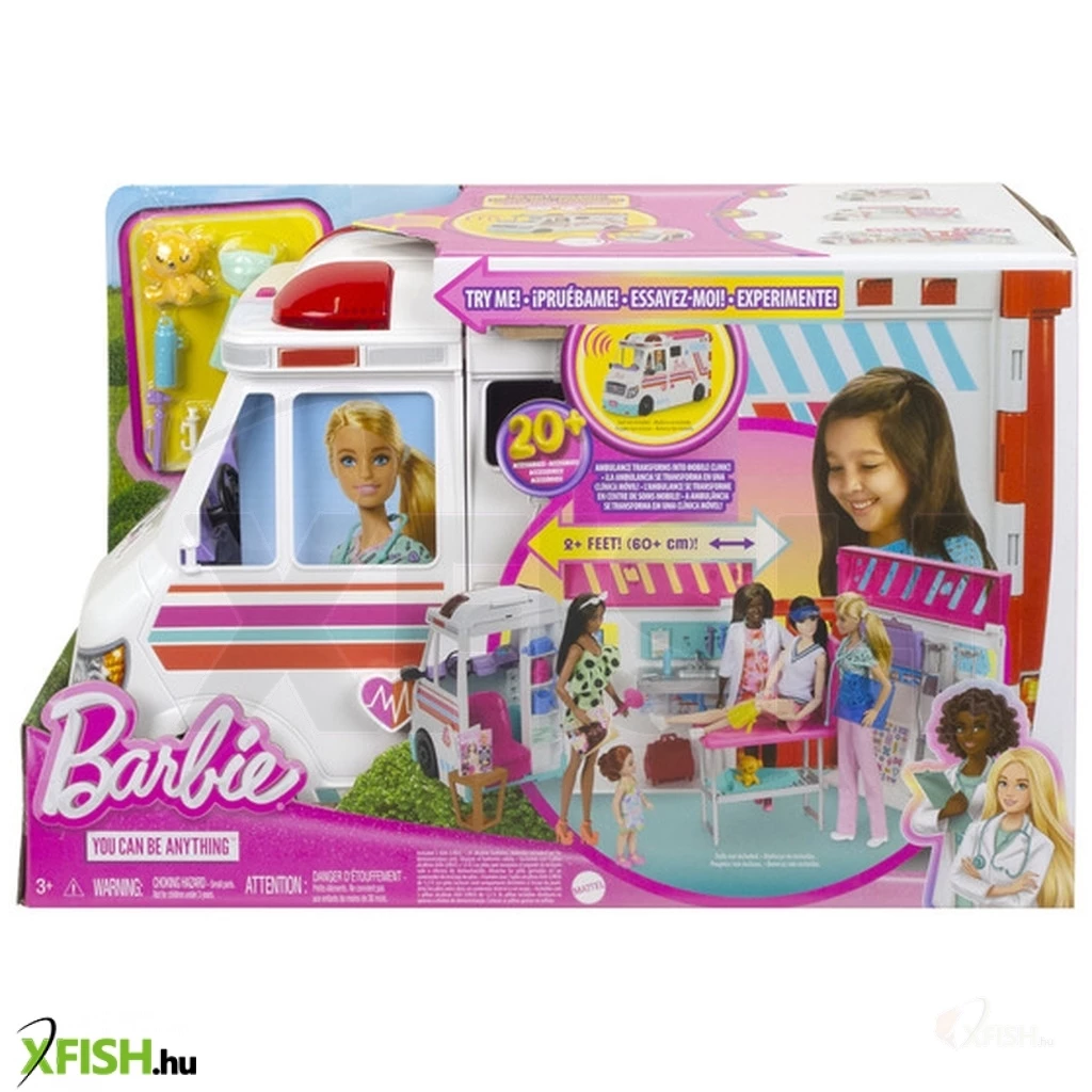 Ezzel a Barbie 2 az 1-ben mentős játékkészlettel a mentőautó vészhelyzetben mindig kéznél van! A 2 az 1-ben mentőautó fényekkel és hangokkal ellátott mentőautóból orvosi rendelővé alakítható, vizsgálóhelyiséggel, vizsgálóasztallal, recepcióval és váróteremmel.