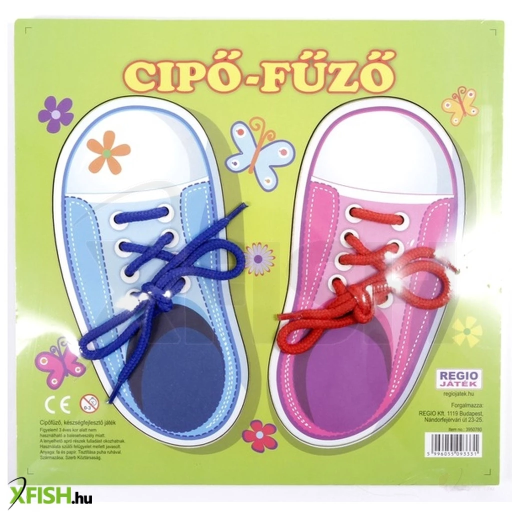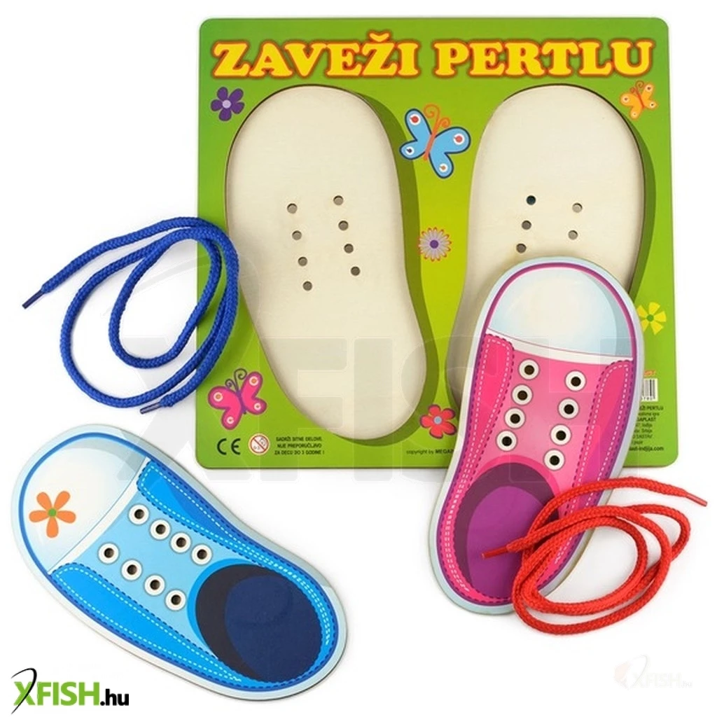 Hogyan kell bekötni a cipőt- A Cipő-fűző fajáték egy keményfából készült lap, amire két cipő van festve. A cipők lyukaiba be tudod fűzni a fűzőt, a csomó és a masni megkötését is gyakorolhatod vele! A Cipőfűző játék fejleszti a kézügyességet. Méretek: 25 x 24 x 1 cm.