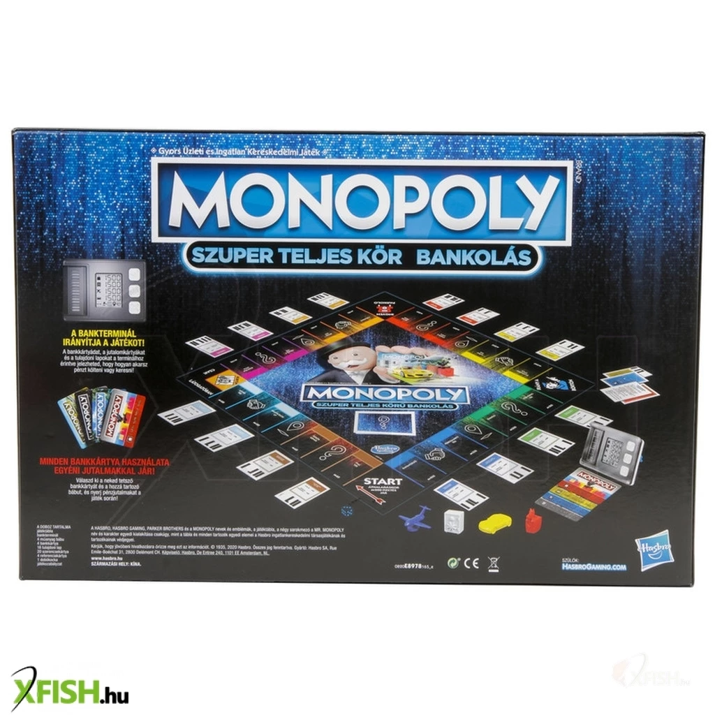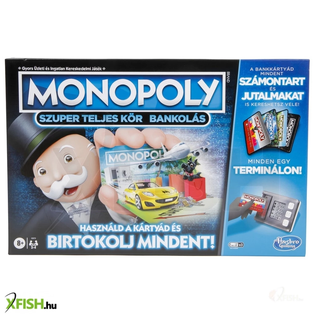 Légy Te a leggazdagabb és repülj a mezőkön át! A Monopoly Super Electronic Banking társasjátékkal most az egyik legmodernebb formában élheted át a már jól ismert Monopoly élményt. A táblajáték merőben eltér az általunk megszokottól, különleges megoldásai miatt. A készpénz eltűnt, mostantól csak bankkártyánk segítségével tudunk fizetni és juttatásokat kapni. Ami ezeket intézi az nem más, mint az elektronikus bankterminál, ami érintéses technológiával működik, ezáltal gyorsabban halad a játék. A pénzhez a már ismert módon, dobások, mezők és szerencsekártyák segítségével juthatunk hozzá. A vasúti rendszer szerepét a légikikötők vették át, melyek segítségével könnyedén elrepülhetsz tőled távolabb álló mezőkre, hogy kicsikard másoktól az ingatlanjukat. Gyűjtsd a pénzt és ne engedd, hogy mások beelőzzenek a gazdagodás útján. A játékot 2-4 főig lehet játszani. A bankterminál 3 db AAA mikro ceruzaelemmel működik, melyet a készlet nem tartalmaz.