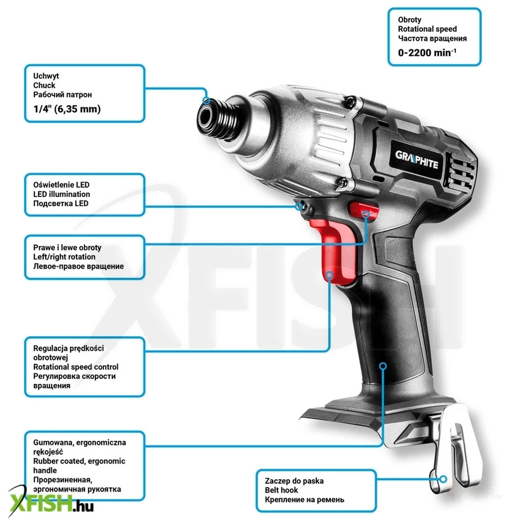 Akkus csavarozógép 18V, Li-Ion, fordulatszám 0-2200 minOO, jobb/bal, forgatónyomaték 180 Nm, szerszámbefogó 6.35 mm (1/4"), orsófék, (LxH) 185 x 225 mm, tömege 1.2 kg, kompatibilis az Energy+ akkumulátorokkal
