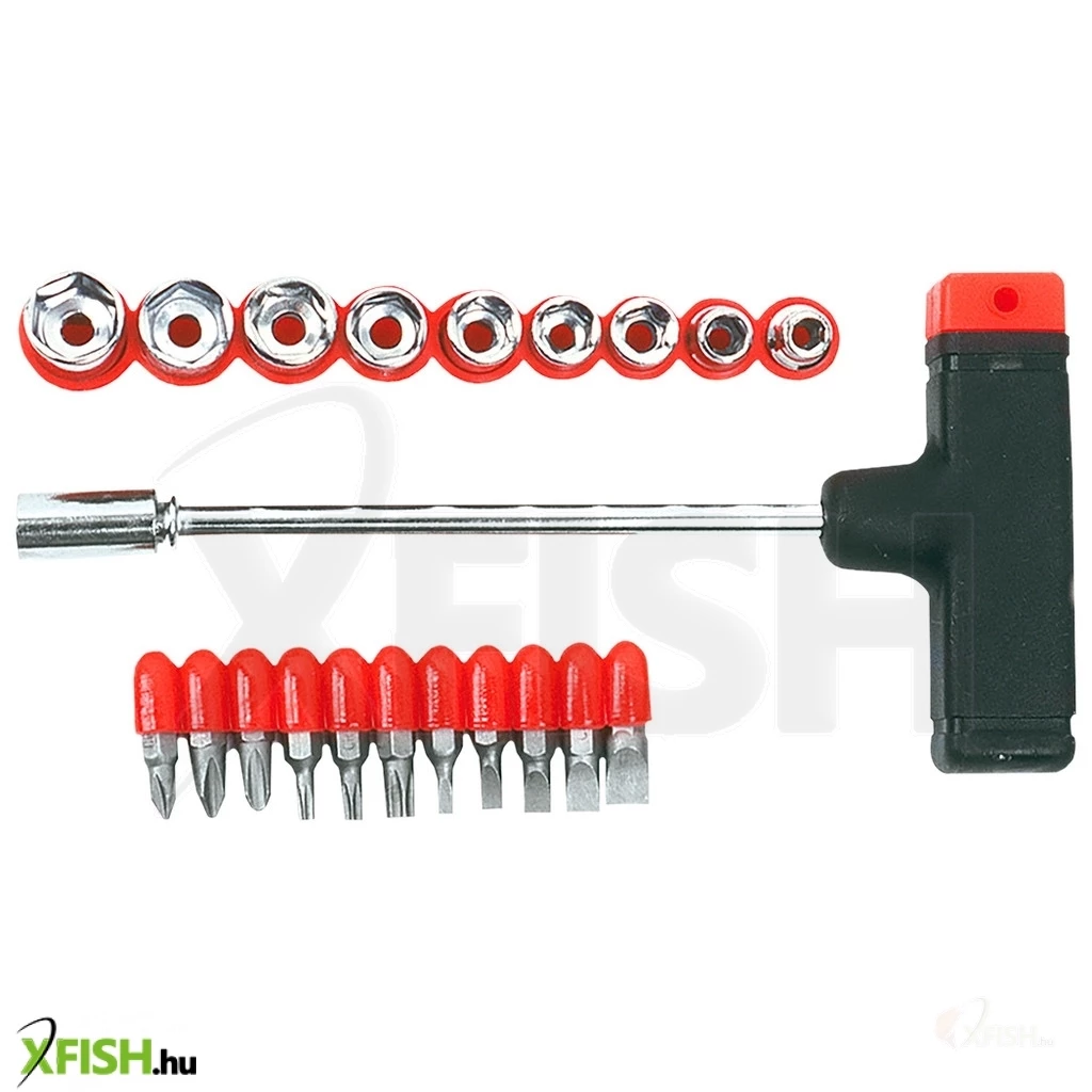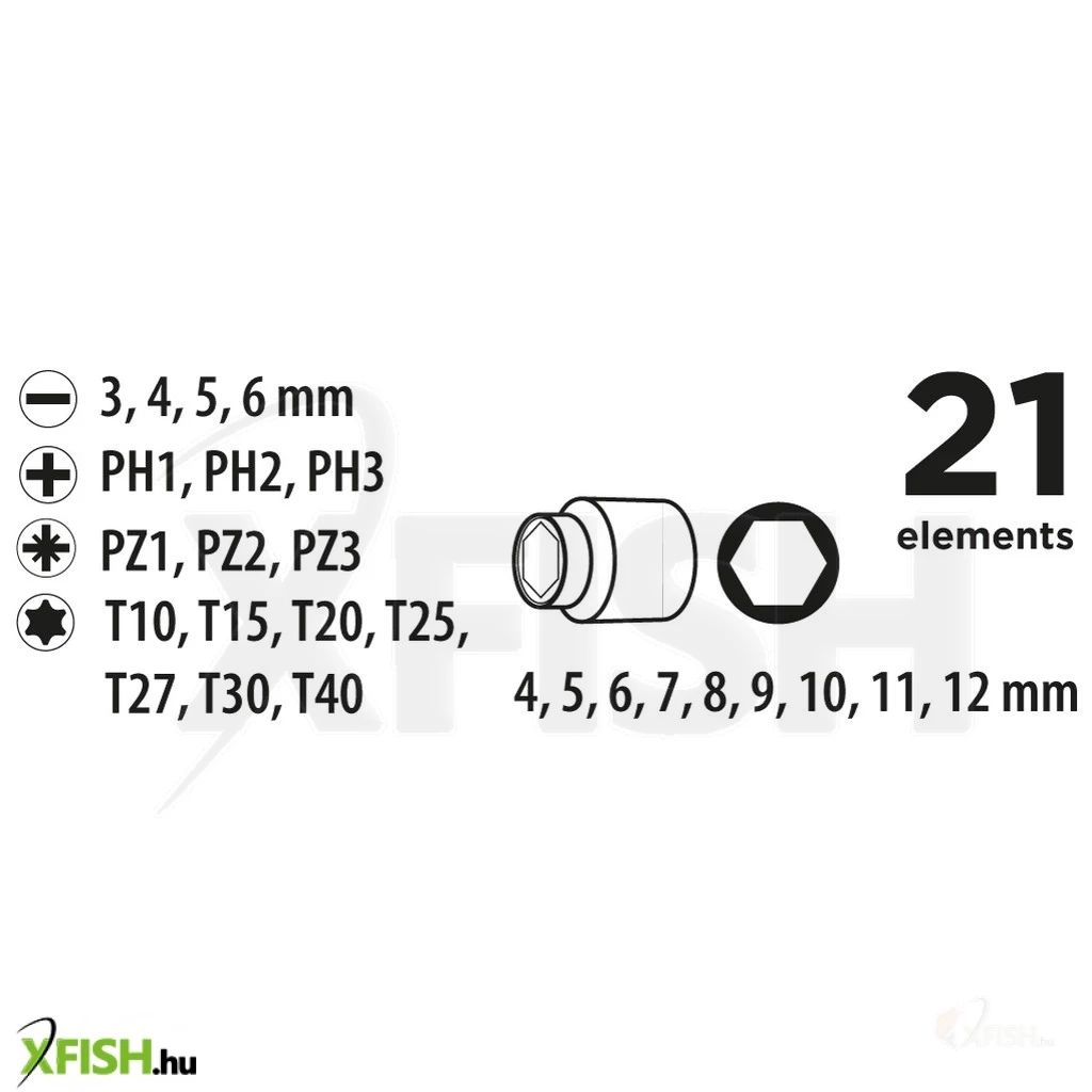 Csavarhúzó bitek és dugók hajtószárral, 21 dbOos klt., T befogószár, csavarhúzó bitek méretek: lapos 3 mm, 4 mm, 5 mm, 6 mm, PH1, PH2, PH3, PZ1, PZ2, PZ3, adapter, imbusz dugók méretek: 4 mm, 5 mm, 6 mm, 7 mm, 8 mm, 9 mm, 10 mm, 11 mm, 12 mm