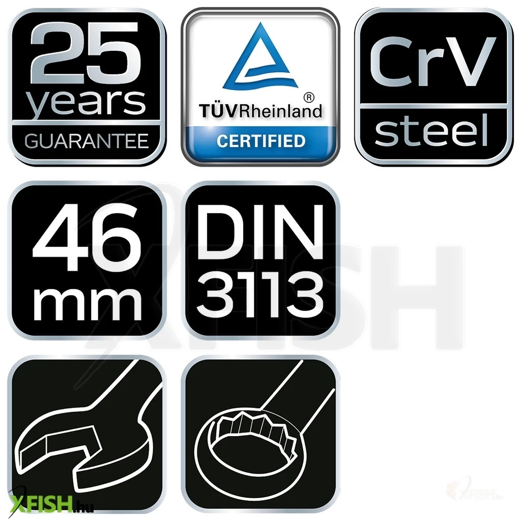 A Neotools csillag-villáskulcs 46x500mm CrV, egy megbízható és precízen megtervezett kézi szerszám, amely ideális választás mind professzionális szerelők, mind lelkes barkácsolók számára. Ez a kulcs a DIN 3113 szabvány szerint készült, így biztos lehet benne, hogy egy kiváló minőségű, tartós eszközzel dolgozik. A CrV acélból készült kialakítás biztosítja a termék szilárdságát és hosszú élettartamát, miközben ellenáll a rozsda és a kopás hatásainak is.